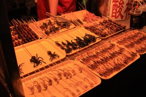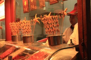 Nous avons visité les marchés de nuit, où grand nombre de chinois viennent y picorer des brochettes ou des barquettes. Et là, un grand choix est proposé: brochettes d’étoile de mer/scorpions encore vivants/grosses larves marron/araignées/hippocampes, gros tas de tentacules, poussins…Et quelle odeur de tripes…