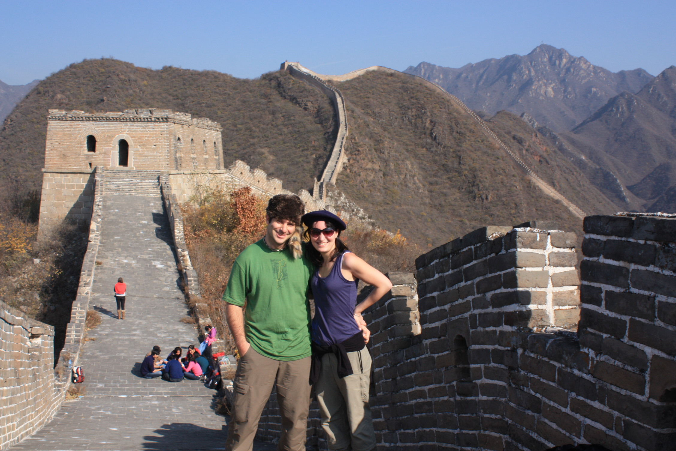 Du coup, la mode fut lancée pour chaque voyageur d’avoir son petit truc quétaine (=kitch) lui permettant de se démarquer. Donc pour ceux qui suivent le blog depuis notre départ vous avez probablement une petite idée du dit truc ridicule que nous avons choisi. En effet, nous laissant porter par les stéréotypes et le fait que nous soyons une française et un canadien, nous avons décidé de prendre des photos de nous, arborant fièrement un chapeau typique de nos pays respectifs. Pour ma part il s’agit un superbe casque en poils, doté d’une queue de raton laveur synthétique je crois….. Du coté d’Émeline, on parle d’un authentique béret, portant le logo de l’équipe de rugby de Clermont-Ferrand, champion de France 2010, j’ai nommé l’ASM.