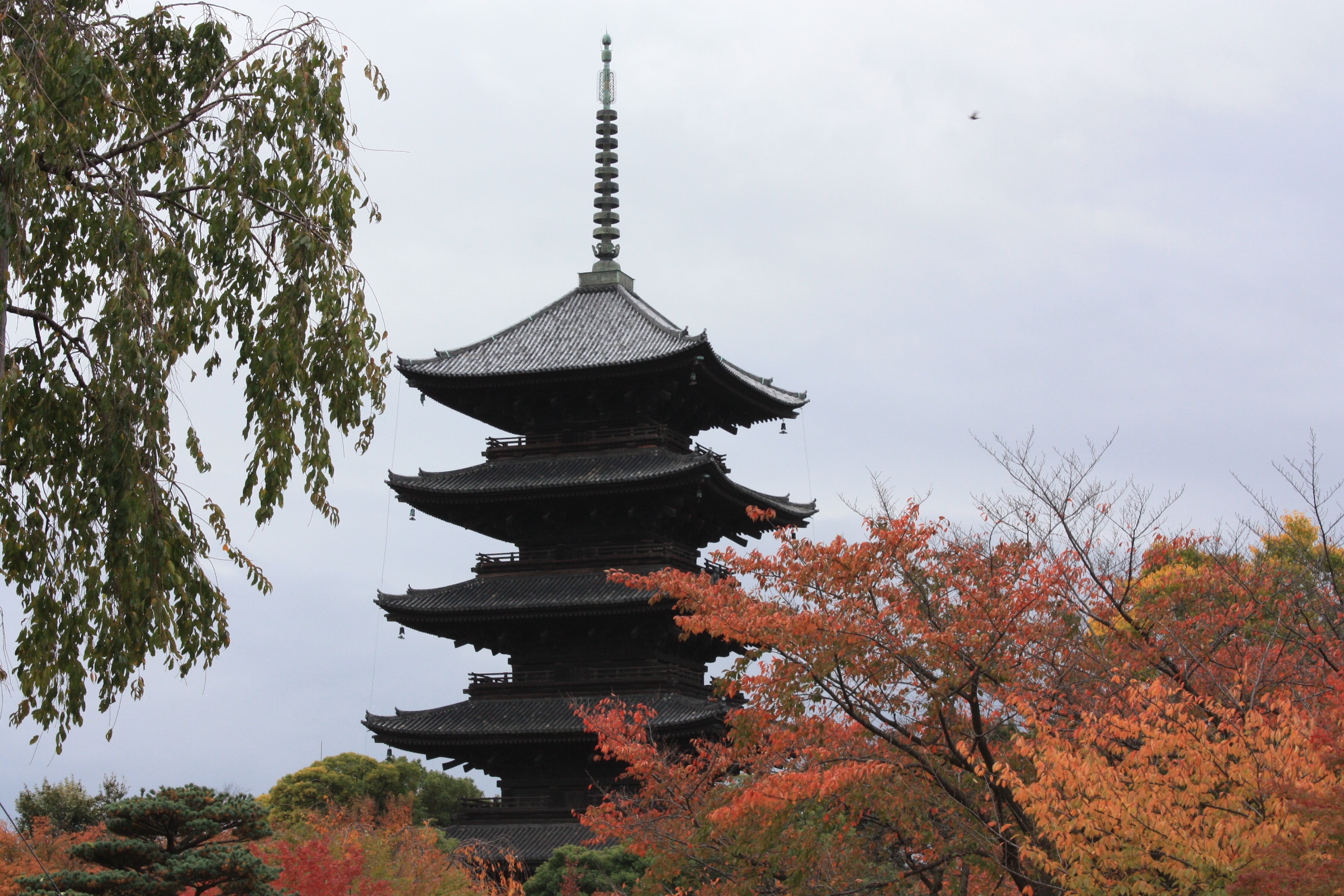 Tout d’abord, nous sommes allés au Temple Toji, tout au sud de Kyoto. Maintenant que nous maitrisons le réseau de bus, la ville nous semble bien plus abordable! Cette pagode en bois (l’une des bâtisses du temple), haute de 5 étages (57 m), est construite pour la première fois en 796 pour protéger la ville. Elle sera maintes fois reconstruite après des incendies, et a sa forme actuelle depuis 1644. Elle est la plus haute de toutes les pagodes du Japon. Ce temple est reconnu comme patrimoine mondial de l’UNESCO.