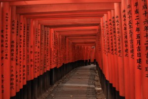 Nous arrivons ensuite au sanctuaire Fushimi et à ses fameuses torii. Il est intéressant de savoir que chacune de ces toriis ont été offertes par une personne ou une entreprise ayant réussi en affaire. Ce temple étant dédié au patron des affaires, l’offrande d’une torii est un signe de remerciement pour leur succès. Je n’imaginais pas que cette allée puisse être aussi longue!! Nous n’en ferons qu’une petite partie car il nous aurait fallu des heures pour en parcourir l’intégralité et ce soir, nous avons rendez-vous au Gion corner! Nous en parlerons par la suite.