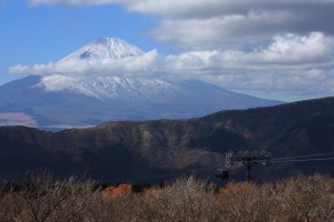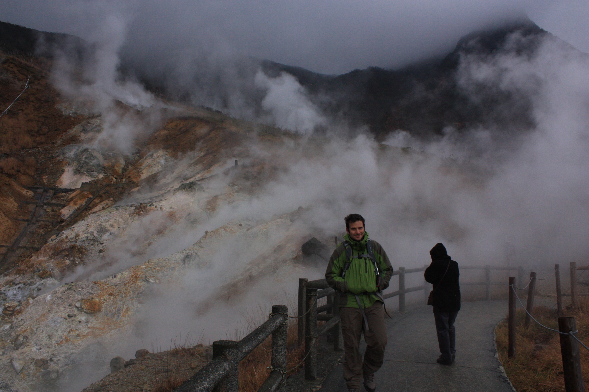 Sitôt arrivés à Tokyo par le bus de nuit, nous prenons un train direction Odawara, puis un bus pour notre guest house à Hakone. Nous arrivons enfin à bon port, plus de 12h après avoir quitté Kyoto. Il y a quelques nuages mais le temps est relativement clair, même si nous avons perdu quelques degrés en prenant de l’altitude. Nous décidons donc d’aller voir l’attraction du coin, le grand, l’unique, le majestueux Mont Fuji (ou Fujisan pour les japonais)!!! Nous prenons le téléphérique jusqu’à la station Owakudani (surnommée la Grande Vallée Bouillante), un site volcanique très actif, d’où jaillissent des vapeurs d’eau et de soufre. Il y a plusieurs carrières de soufre et de fumerolles, et l’air sent l’oeuf…