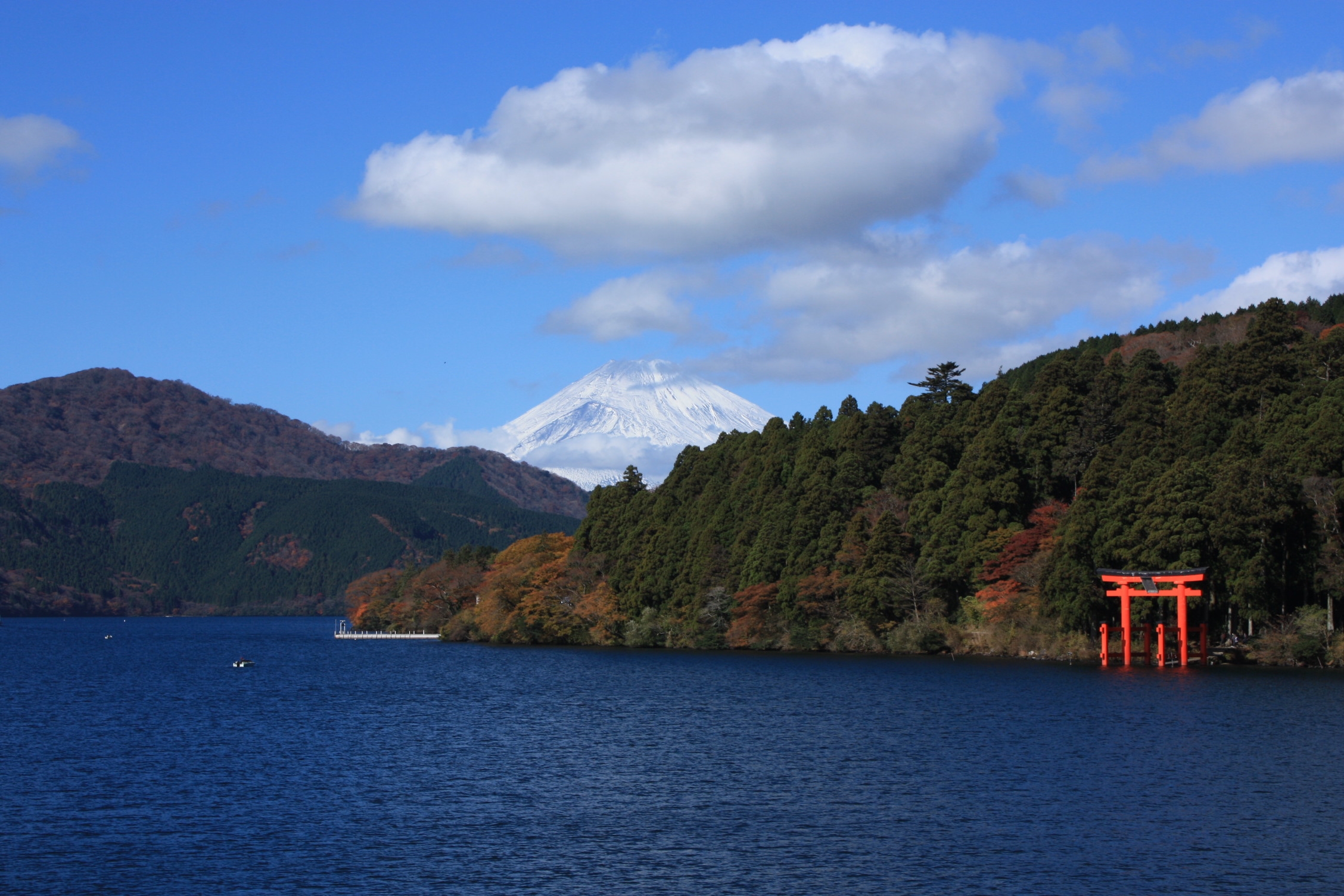 Célèbre vue du Mont Fuji depuis le lac Ashi, avec une torii dans l’eau en premier plan