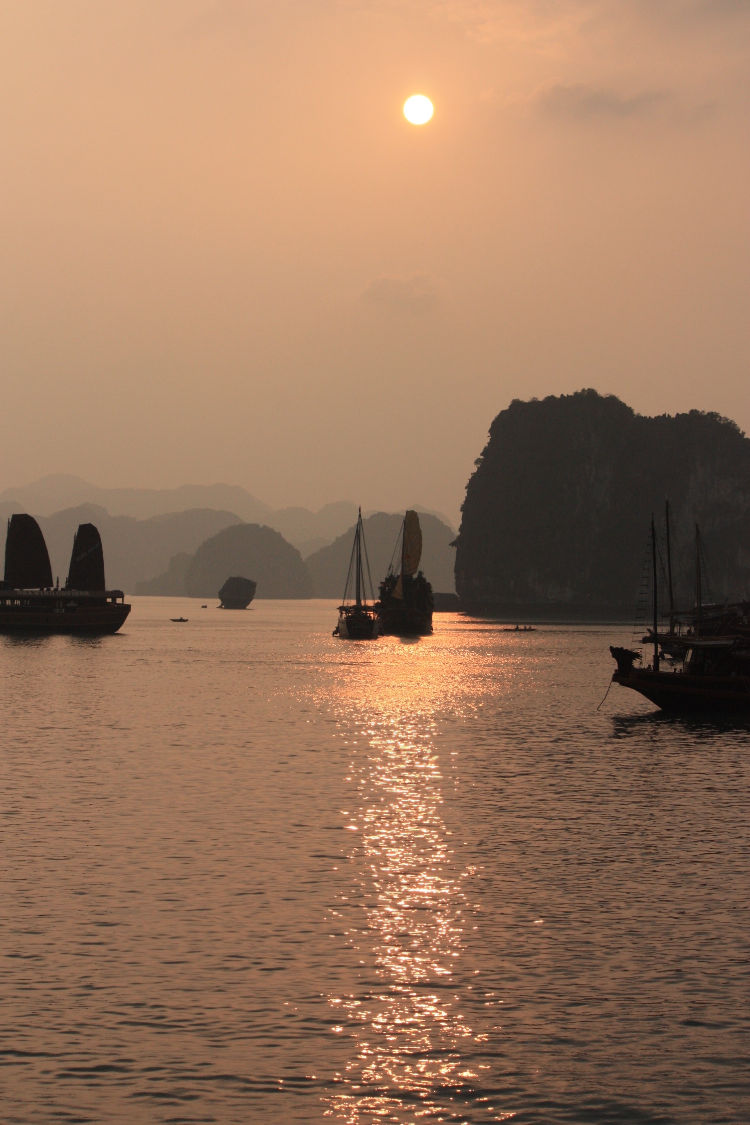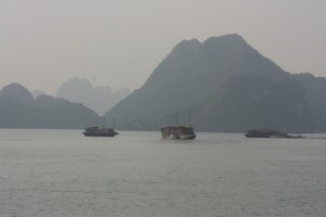 4 heures de route plus tard, nous permettant de faire connaissance avec notre guide, Tom, nous arrivons enfin à destination et nous embarquons à bord du bateau. Nous ne sommes pas en grande période touristique et heureusement, car il y a déjà énormément de bateaux similaires, qui voguent en direction de la baie. Après un repas des plus copieux, nous pouvons profiter à loisir du magnifique panorama qui nous est offert, et comme dirait André, nous avons notre premier Wahou du Vietnam. Le temps brumeux de cette période de l’année n’est en rien dérangeant, il apporte même un aspect mystérieux à cette mer de rochers. La Baie d’Halong regroupe environ 2000 îlots rocheux, appelés pains de sucre, de toutes les formes et de toutes les tailles. Ce paysage si particulier a été façonné par les années, puisqu’au départ, il devait s’agir d’un immense plateau. L’eau de pluie s’y est infiltrée, faisant s’effondrer d’énormes masses calcaires, et seules les roches les plus dures ont résisté.