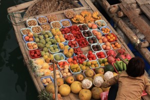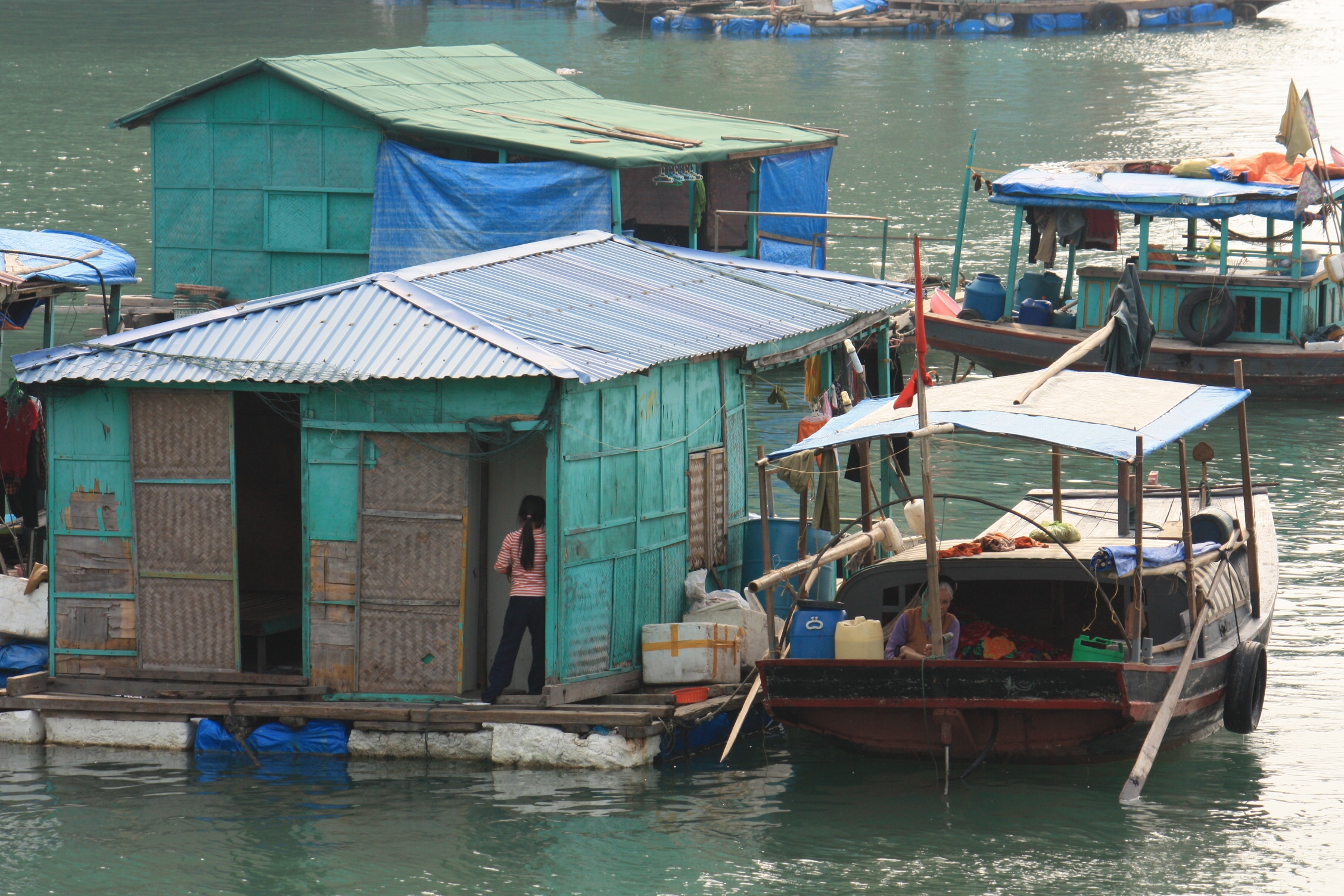 Le lendemain, nous reprenons le minibus jusqu’à l’embarcadère, où nous reprenons un bateau (le même en fait, qui a déjà fait l’aller retour). Avant de retourner à la ville d’Halong, nous passons par un petit village flottant, d’anciens pêcheurs, reconvertis en loueurs de kayaks et bateaux de bambous et en vendeurs de fruits ou poissons pour les touristes. Moi qui suis avide de découverte de cultures/modes de vie différentes, je suis aux anges et pendant que certains visitent une grotte à bord d’une petite embarcation, je capture des instants de vie de ce peuple des mers. Tout est coloré, tout semble simple, à des années lumière de notre vie à nous…