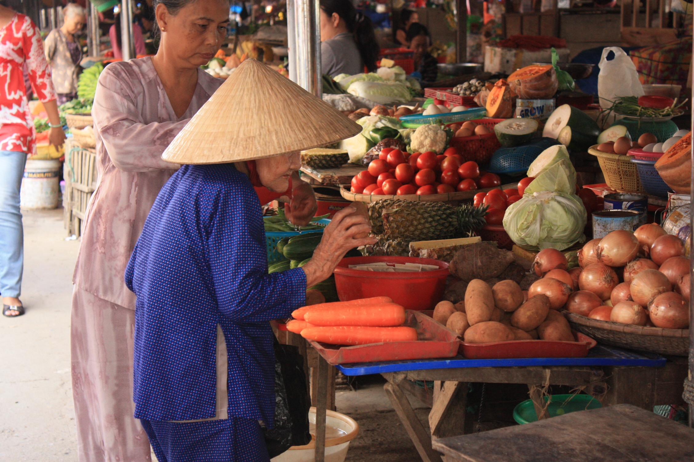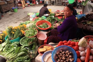 La séance débute par une visite au marché. Vina, notre jeune cuisinière qui nous a tant plu la veille, nous emmène à travers les allées verdoyantes et odorantes et nous explique comment choisir ses légumes, notamment ceux qui nous sont inconnus. Et il y en a beaucoup ici!! Rassurée par la présence de Vina et par le fait qu’on achète des produits, j’en profite pour prendre quelques clichés, car en général, je trouve déplacé de photographier à tout va les gens dans leur quotidien. Nous en profitons également pour nous renseigner sur les prix et pour acheter des épices pour la confection d’un « poulet 5 saveurs », goûté dans un précédent restaurant. Avec l’aide d’une locale, c’est toujours plus simple!!