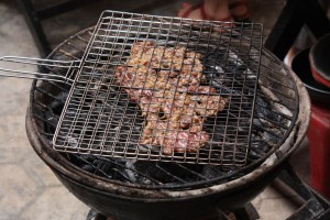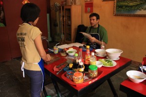 De retour au restaurant, nous revêtons nos tabliers et c’est parti! La veille, nous avions choisi 4 plats parmi ceux proposés. Nous apprenons donc les secrets de la réussite du « Boeuf au graines de sésame », de la « Soupe de nouilles au poulet », du « Porc dans un pot d’argile » et des « Nems frits au porc ».Pour ces derniers, nous en avions déjà faits à la maison, mais la cuisson avait été un vrai désastre! En les mettant dans l’huile, de grosses cloques se formaient, faisant éclater nos nems et carbonisant l’intérieur!