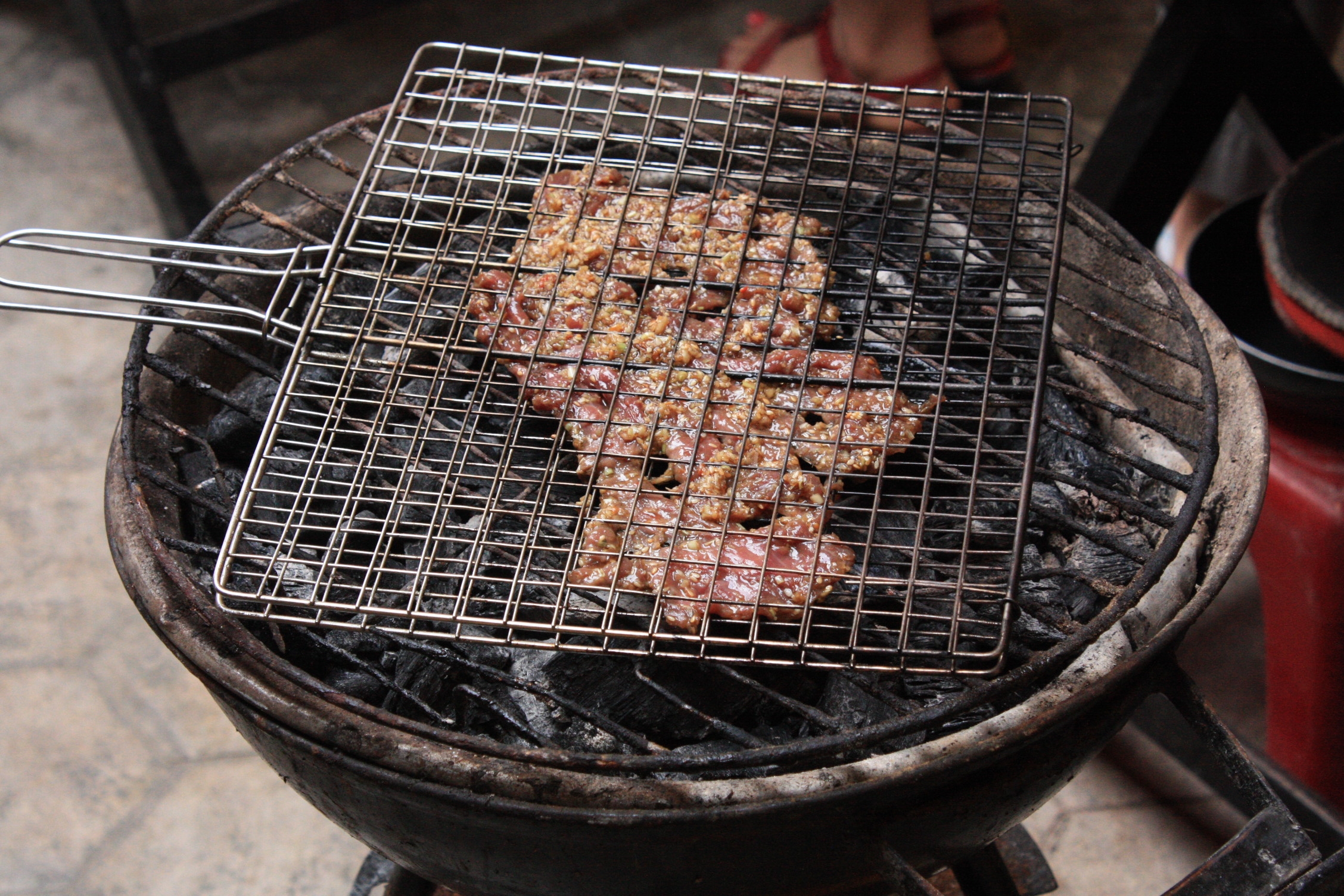 C’est une genre de salade de viande remplie d’herbe. Je sais qu’au Vietnam leur spécialité c’est la salade de Boeuf semi cuite avec des tripes de boeuf, du pimets fort, coriandre, feuille de menthe, échalottes grises, jus de lime , feves longues et plusieurs autres herbres. Les vietnamiens font cette salade sucré en général tandisque que les cambodgiens la fond plus sure.