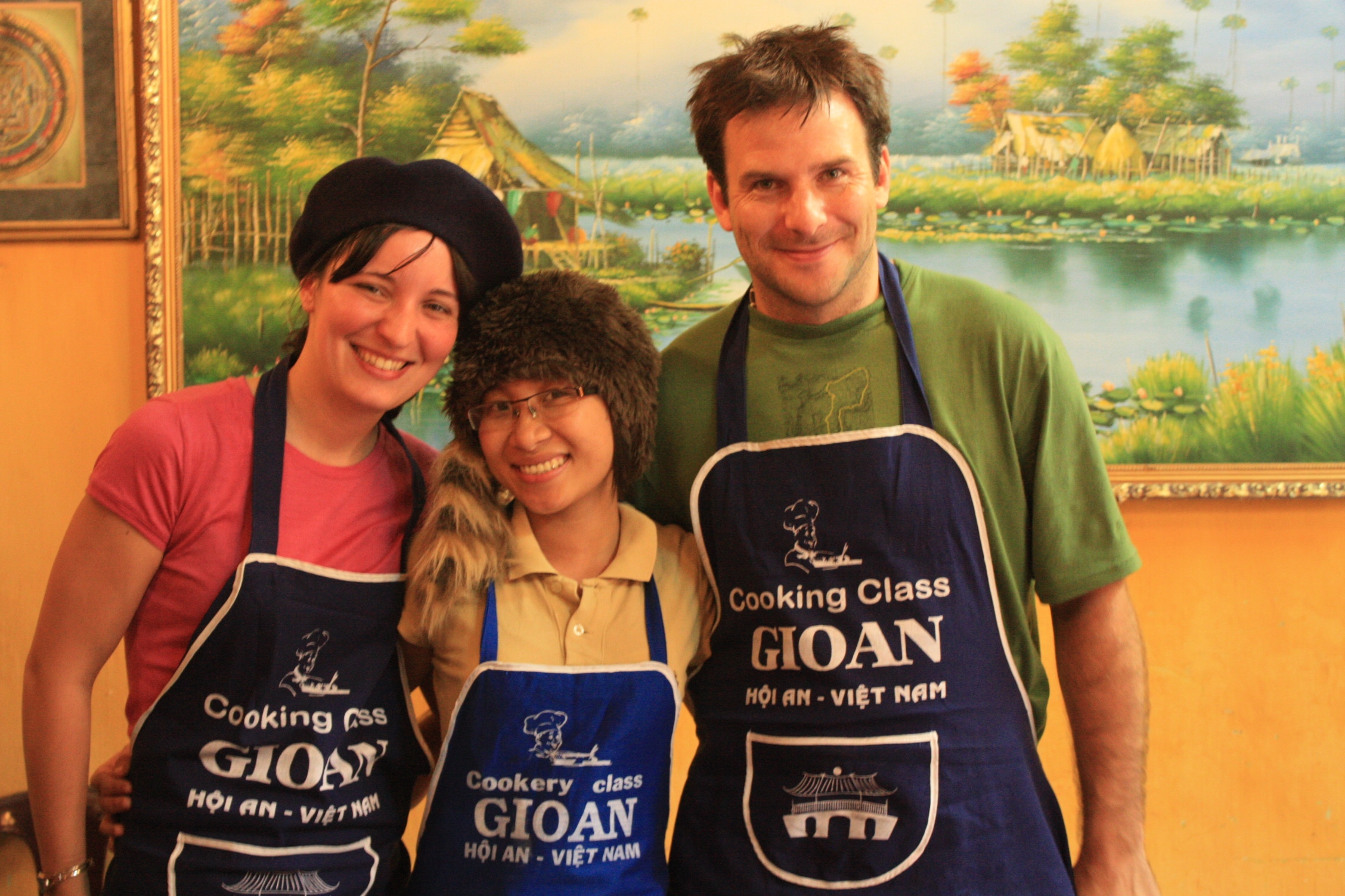 Nous avons donc décidé de prendre des cours de cuisine, pour apprendre à confectionner quelques spécialités et ainsi continuer de se régaler après notre retour. A Hoi An, ville assez touristique, la grande majorité des restaurants proposent des cours de cuisine. Parmi ceux-ci, nous en avons choisi un sur un coup de coeur, le restaurant Gioan, car la jeune fille qui nous a accueillis nous a séduits. Elle est drôle et baragouine, un peu difficilement, quelques mots de français. Mais elle essaye courageusement! Nous prenons donc rendez-vous pour le lendemain!