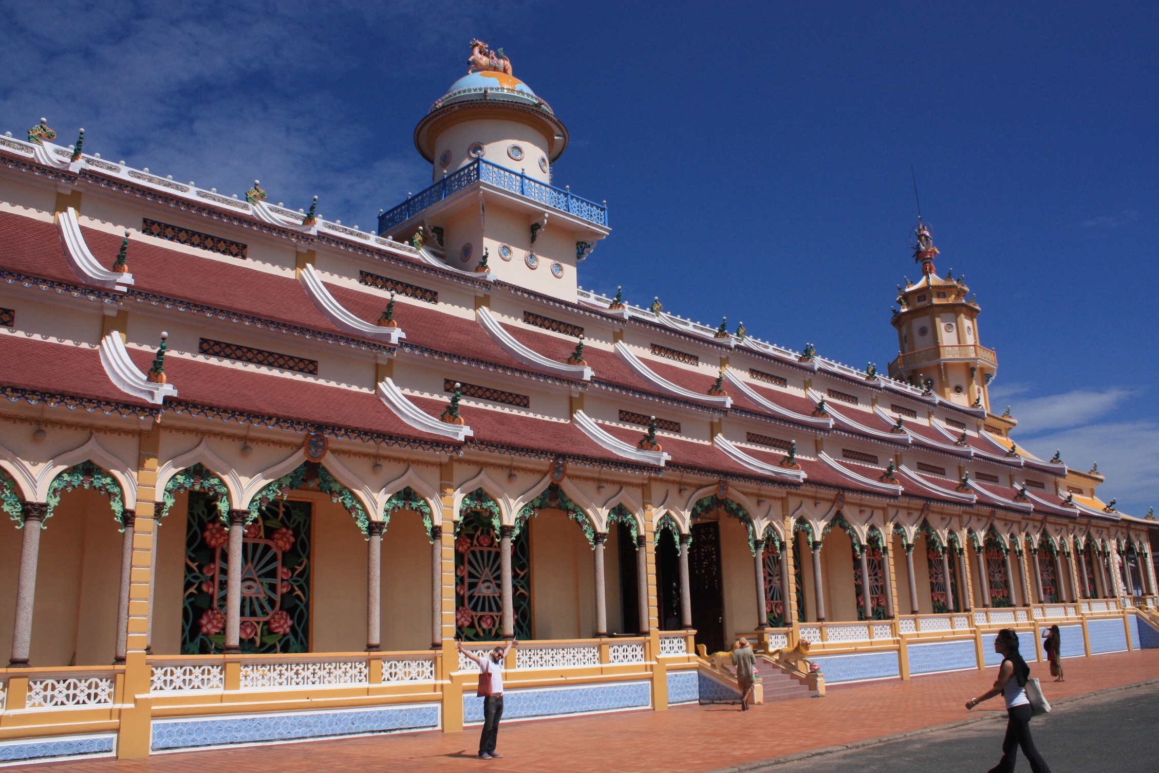 En fait, nous y allons plutôt pour assister à la messe qui s’y déroule 4 fois par jour. A Tay Ninh, se trouve le siège de la religion Caodai, qui est un mix des différentes religions existantes au Vietnam, soit le bouddhisme, le taoïsme et le confucianisme venus de Chine, l’hindouisme venu d’Inde, et un peu le christianisme. La religion Caodai emprunte à chacune d’entre elles ses « bons côtés ».