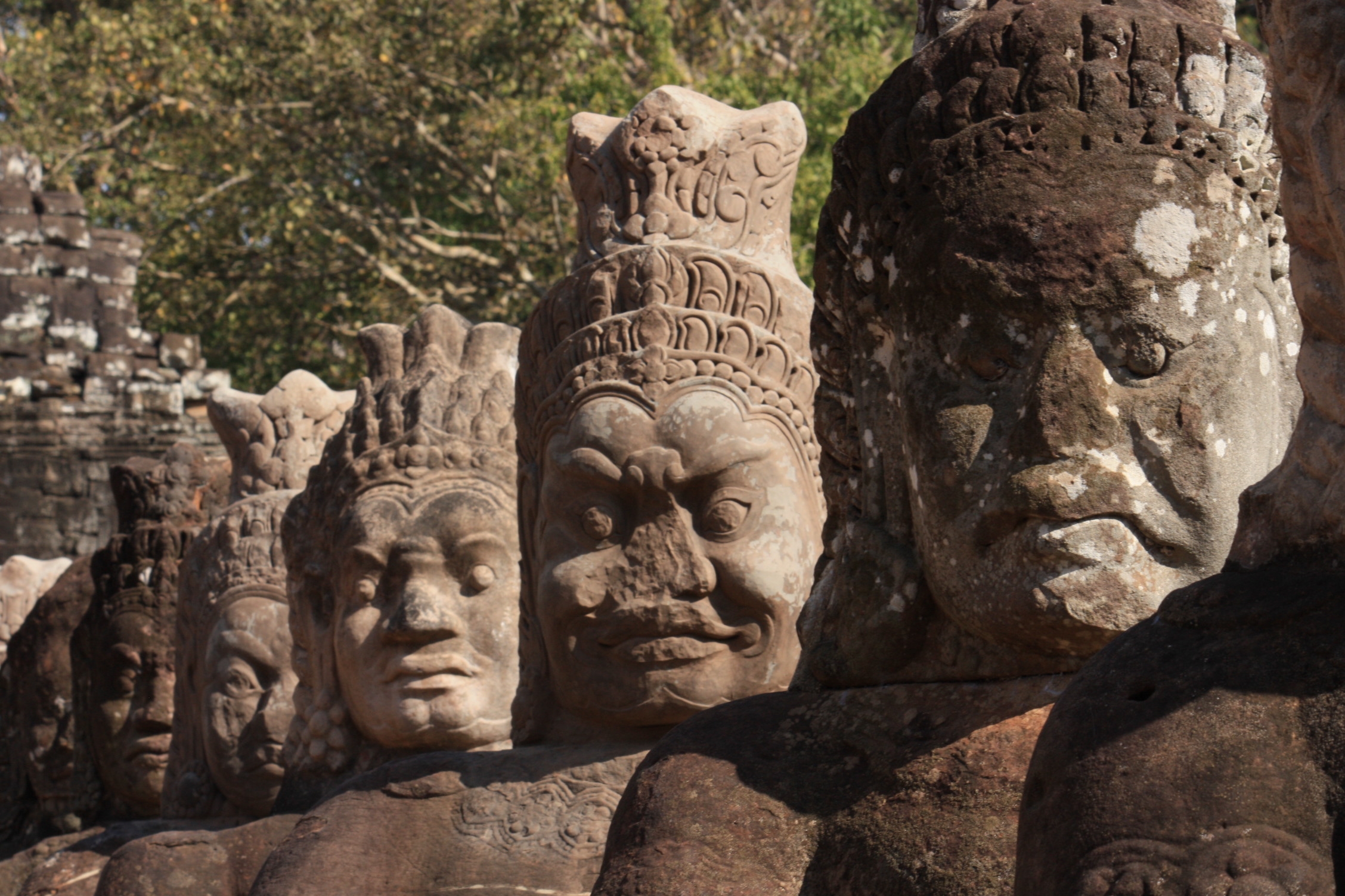 Le premier jour, nous commençons par le « petit circuit », avec tout d’abord, le groupe d’Angkor Thom que l’on atteint en franchissant une colossale porte, surmontée d’une tête à 4 visages. De chaque côté de l’allée principale y menant, se trouvent 54 statues de géants, soutenant la queue d’un naga sacré, un serpent mythique à 7 têtes. Ce site hébergea jusqu’à 100 000 habitants au Moyen Age, mais il ne reste plus rien de ces maisons, construites en bois et en paille, donc détruites par le temps.