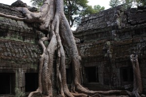 Nous atteignons ensuite Ta Phrom, également connu car très photogénique. Il a d’ailleurs été le lieu de tournage du film « Deux frères » sorti en 2004, racontant l’histoire de pilleurs de temples et de tigres. A la différence de la majorité des autres temples qui ont été dégagés lors de leur redécouverte, celui-ci a été laissé à la merci de la nature et la forêt a pu garder le dessus. Il s’agit donc d’un enchevêtrement de racines et de pierres, ce qui, si on fait abstraction de tous les touristes, nous donne un peu l’impression de le découvrir après des années de sommeil. Avec le Bayon, il s’agit de notre duo de préférés!! Il a été construit vers 1186 et fut, à l’époque, l’un des plus gigantesques temples d’Angkor. Pour la minute « nature », il faut savoir que le fromager est le prédateur le plus redouté sur ce site. En effet, les graines de cet arbre sont rejetées dans les déjections des oiseaux, et germent entre les pierres du temple, faisant écrouler des pans de murs.