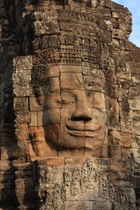 Angkor Thom contient le célèbre temple Bayon (dont le nom signifie « montagne magique »), que l’on a tous déjà vu au moins une fois en photo, bien qu’il soit moins connu qu’Angkor Wat. Il a été construit entre la fin du XIIe et le début du XIIIe siècle. Il s’agit d’une massive montagne de tours en pierre, haute de 43 mètres. Les sommets de ces tours sont ornés de têtes à 4 visages, sensés représenter les 4 vertus de Bouddha: sympathie, pitié, humeur égale et égalité. Quelle que soit la direction dans laquelle on regarde, on croise donc ces visages au sourire figé. Malgré la chaleur accablante et le nombre de touristes (souvent irrespectueux des autres, comme des vestiges du temple), je ne me lasse pas de les contempler. Nous retournerons d’ailleurs au Bayon, le soir de notre 3ème jour de visite, pour y prendre à nouveau quelques photos à la lumière déclinante, et c’est un temple quasiment vidé de ses visiteurs que nous retrouvons. On s’y sent alors drôlement bien, comme apaisé!