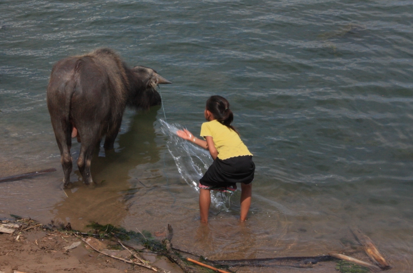 Depuis ces îles, on peut également apercevoir quelques dauphins d’eau douce. En ayant déjà vu à Kratie au Cambodge, nous avons hésité puis finalement, afin de nous faire jalouser un peu plus par Elfie, nous nous sommes à nouveau laissés tenter. Cela permet également aux locaux de prendre conscience de l’importance de protéger cette espèce, qui attire tant les touristes et donc fait marcher l’économie locale. Nous avons constaté qu’il est plus difficile d’en voir ici, même si nous apercevons quand même quelques dos et ailerons. Cette population semble un peu plus dispersée qu’à Kratie, où nous avions l’impression que les dauphins restaient dans un périmètre assez restreint. Nous sommes quand même heureux de l’excursion!