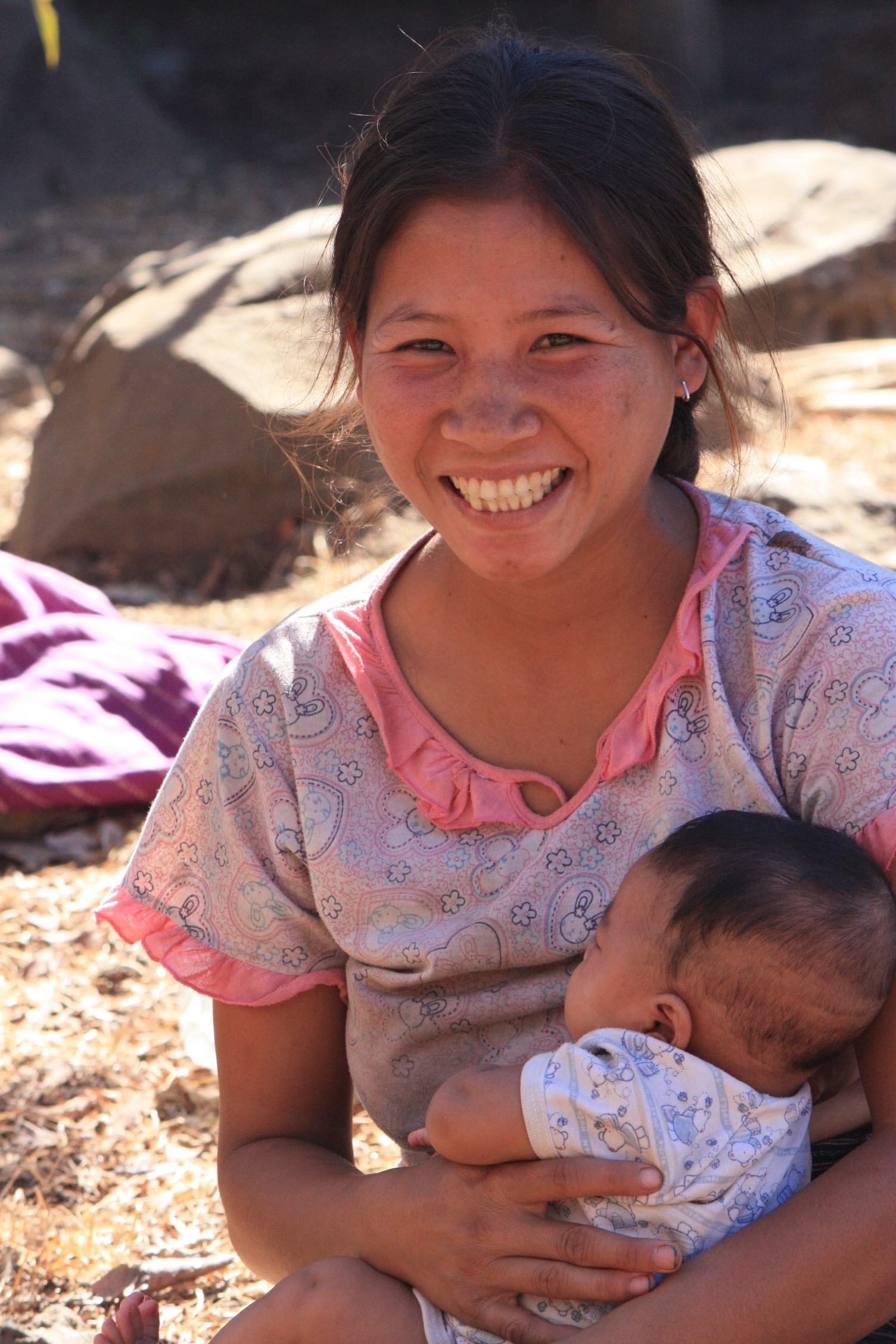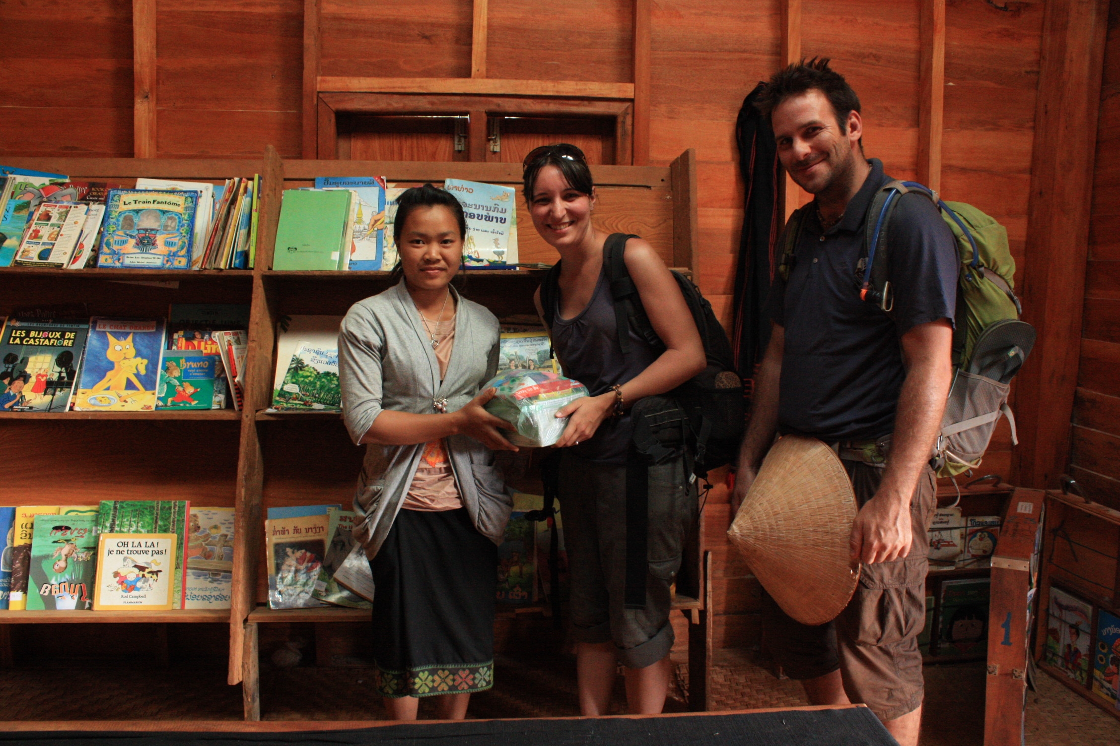 Pendant nos visites, c’est avec plaisir que nous découvrons de nouvelles ethnies. Celle que nous attendions avec impatience se nomme « Katou ». Nous avions vu dans un reportage peu avant notre départ en voyage, que ces gens avaient 2 particularités: ils font leurs cercueils de leur vivant qu’ils conservent sous leur maison, et tous les habitants fument du tabac, quelque soit leur âge. Nous visitons donc ce village qui nous intrigue, avec un guide local qui parle un excellant anglais, en plus de placer quelques phrases de français. Nous y apprenons que les hommes ont entre deux et quatre femmes, que les gens s’entassent jusqu’à 60 personnes dans une cabane d’environ 50m2 et que tout ce beau monde fume le tabac avec des pipes à eau, faites de bambou. Et quand on dit tout le monde, c’est absolument tout le monde, ayant plus de 4 ans…Comme il ne faut pas exagérer, ils respectent quand même les poumons des nouveaux-nés, ouf! C’est vraiment troublant de les voir ainsi dépendants: notre guide nous fait entrer dans une maison pour en voir l’intérieur et durant les quelques minutes où Emeline prend ses photos, il n’a pas pu s’empêcher de demander quelques bouffées à l’hôte. André a demandé, ils ne fumeraient que du tabac…Concernant les cercueils, notre guide nous en montre quelques uns dans une petite cabane à l’entrée du village, mais ce seront les seuls que nous verrons. Il faut croire que cette tradition s’est évanouie peu à peu et que ceux encore exposés sont davantage pour les touristes que pour eux.  En quittant le village, nous faisons un passage à l’école, où nous remettons des cahiers, des crayons et des ballons au professeur, pour aider les défavorisés.