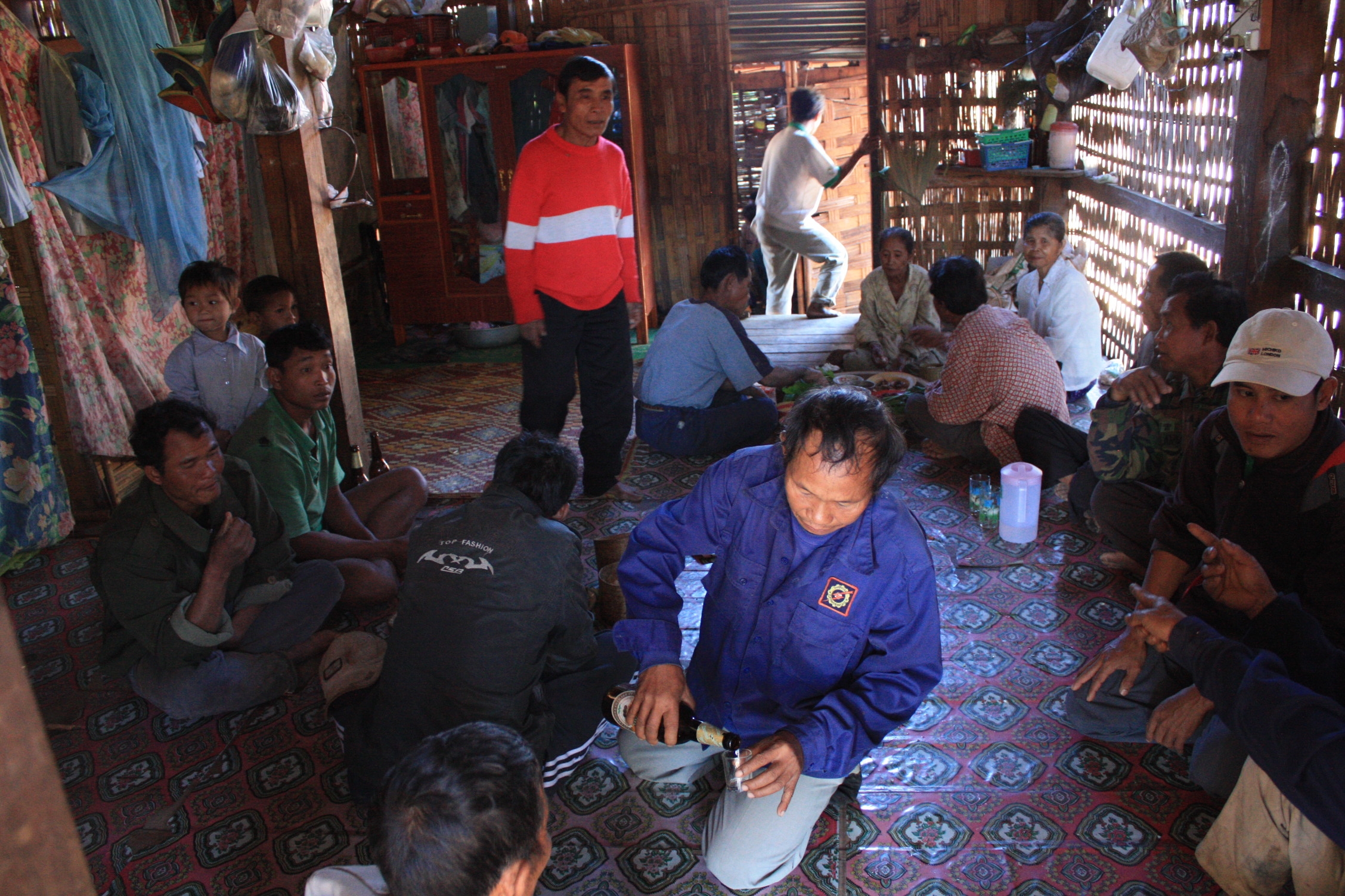 Parmi ces villages, nous visiterons également le village « Tanglee », qui veut dire bambou, avec un autre guide local, casque de découvreur sur le crâne et machette à la main. Cette visite nous permet de vivre une expérience hors de l’ordinaire. En effet, dans ce village, nous rencontrons la minorité Nge. Notre guide nous recommande de ne rien donner à personne et de bien lui demander avant de faire quoique ce soit qui pourrait choquer. Emeline doit d’ailleurs cacher son décolleté plongeant! Nous sommes un peu nerveux quand il nous explique que dans le village, se tient une sorte de cérémonie et que nous pouvons y assister. En arrivant, on rencontre un groupe de personne assis à côté d’une maison, dans laquelle une jeune femme se cache. Notre guide nous explique qu’il s’agit des parents de la jeune fille, de son prétendant, et des parents de celui-ci, qui sont en train de discuter du prix (en buffles!!!) que devra donner la famille du garçon pour qu’il puisse épouser la jeune fille. On nous invite par la suite à entrer dans une autre maison, où les gens sont en train de célébrer l’accord du mariage, en mangeant. On nous offre de l’alcool de riz (assez fort en alcool!!) que nous ne pouvons refuser, puis on nous offre de goûter au repas. Il faut savoir que le repas en question est composé de riz gluant (une spécialité du Laos, qui se mange roulé en boule avec les doigts), et de viande de buffle, tué le matin même, crue ou bouillie. Bien sûr, nous évitons la viande crue, mais nous tentons tout de même une petite boulette de riz avec un peu de viande cuite. Tout le monde semble bien heureux de nous voir manger leur nourriture, et ils rient bien fort quand nous disons que nous trouvons la viande drôlement épicée!! En effet, au Laos, tout se mange très épicé et nous avons parfois de mauvaises surprises en goûtant le plat que nous avons commandé.