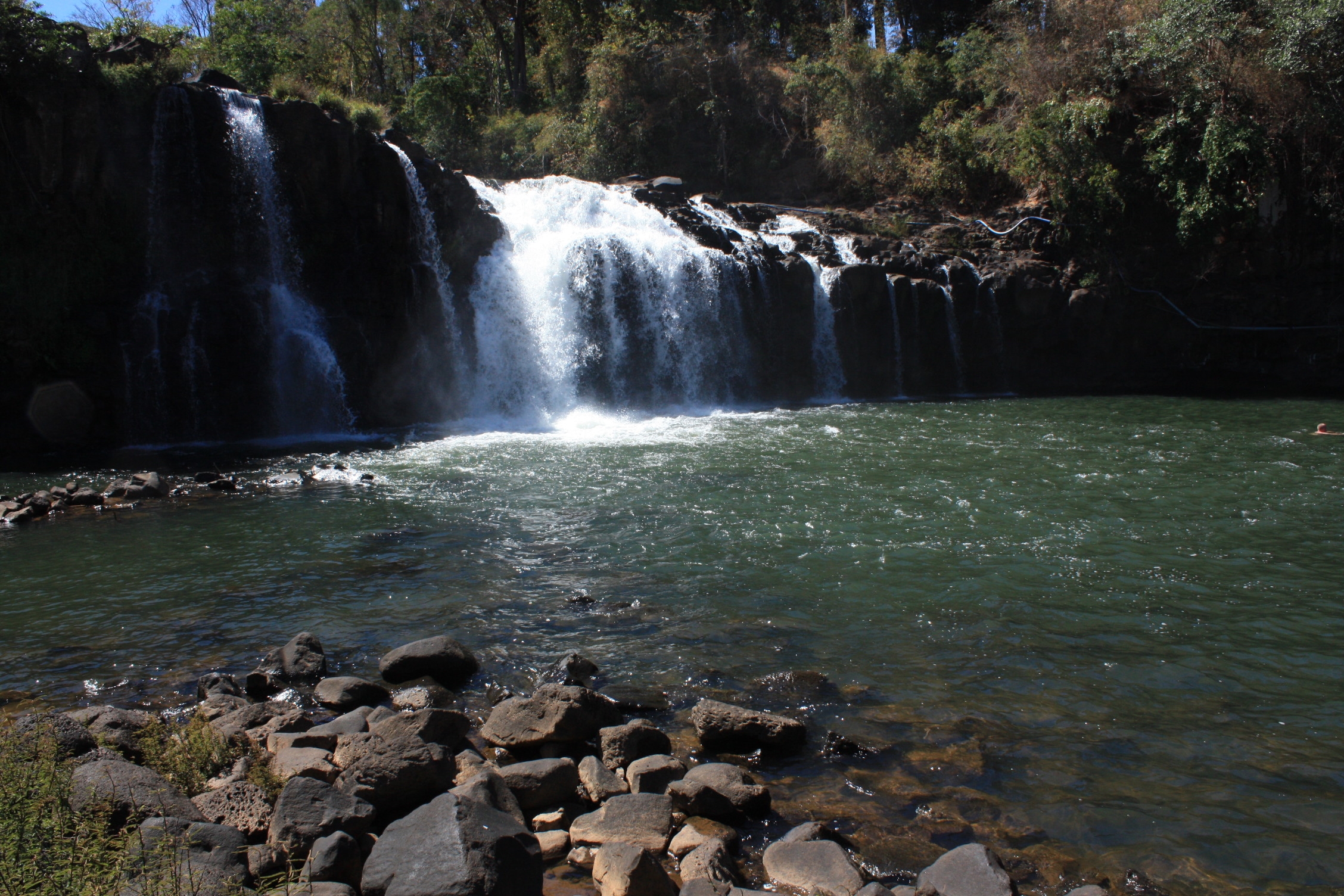 La plateau contient plusieurs rivières, et vu le relief, cela donne une multitude de chutes. Parmi celles-ci, nous en avons « visité » quatre. Nous avons la chance de voir tomber la chute de « Tad Fan », avec deux long filets d’eau d’environ 120m, ce qui fait de cette chute d’eau, la plus haute du Laos. Elle doit vraiment être impressionnante en saison humide, mais il paraît qu’en général, on ne l’aperçoit pas à cause de la vapeur d’eau générée. Nous voyons également les chutes de «Yuang », nommées ainsi d’après une vache noire qu’on trouvait en abondance dans le coin, avant que celle-ci ne soit chassée. La troisième chute, est celle de « Tad Lo », près de laquelle nous passerons la nuit. Elle n’est pas très impressionnante, mais les 30 minutes que nous avons pris pour nager dans son bassin, nous ont bien rafraîchis. La dernière chute que nous avons vue se nomme « Pha Suam »: elle n’est pas très grande, mais on dirait une version miniature des chutes du Niagara, avec sa forme de fer à cheval.