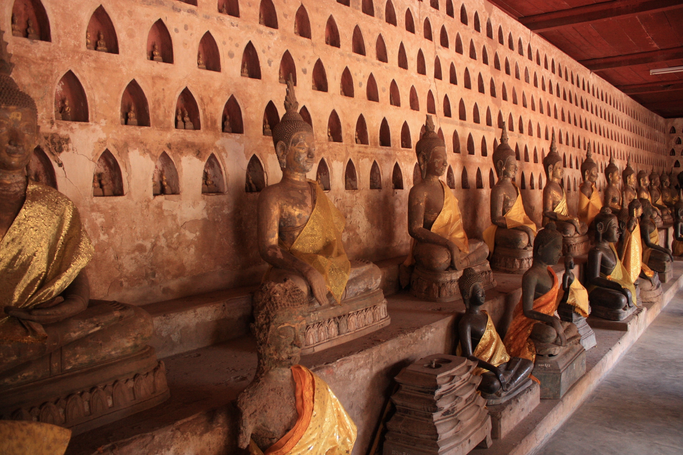Autant le dire tout de suite, nous n’avons pas été emballés par cette ville, qui contient beaucoup de temples. De plus, il faut l’avouer, nous commençons enfin à être rassasiés de tous ces temples, et comme nous n’adhérons pas beaucoup à l’architecture des lieux de culte laotiens, nous n’en visiterons qu’un seul, en attendant que notre chambre dans la guesthouse se libère. Le Wat Sisaket (qui signifie « cheveu sur la tête » !) a été construit au centre de la ville en 1818, dans le style siamois, ce qui lui permis d’être épargné lorsque les Siams (thaïlandais) ravagèrent la ville. Ce temple renferme plusieurs milliers de statuettes de bouddhas, de différentes tailles et drapées d’un tissu jaune-orange, dont de minuscules, logées par couples dans des niches, tout le long de la galerie entourant le bâtiment principal. Les plus anciennes statuettes datent du XVe siècle.