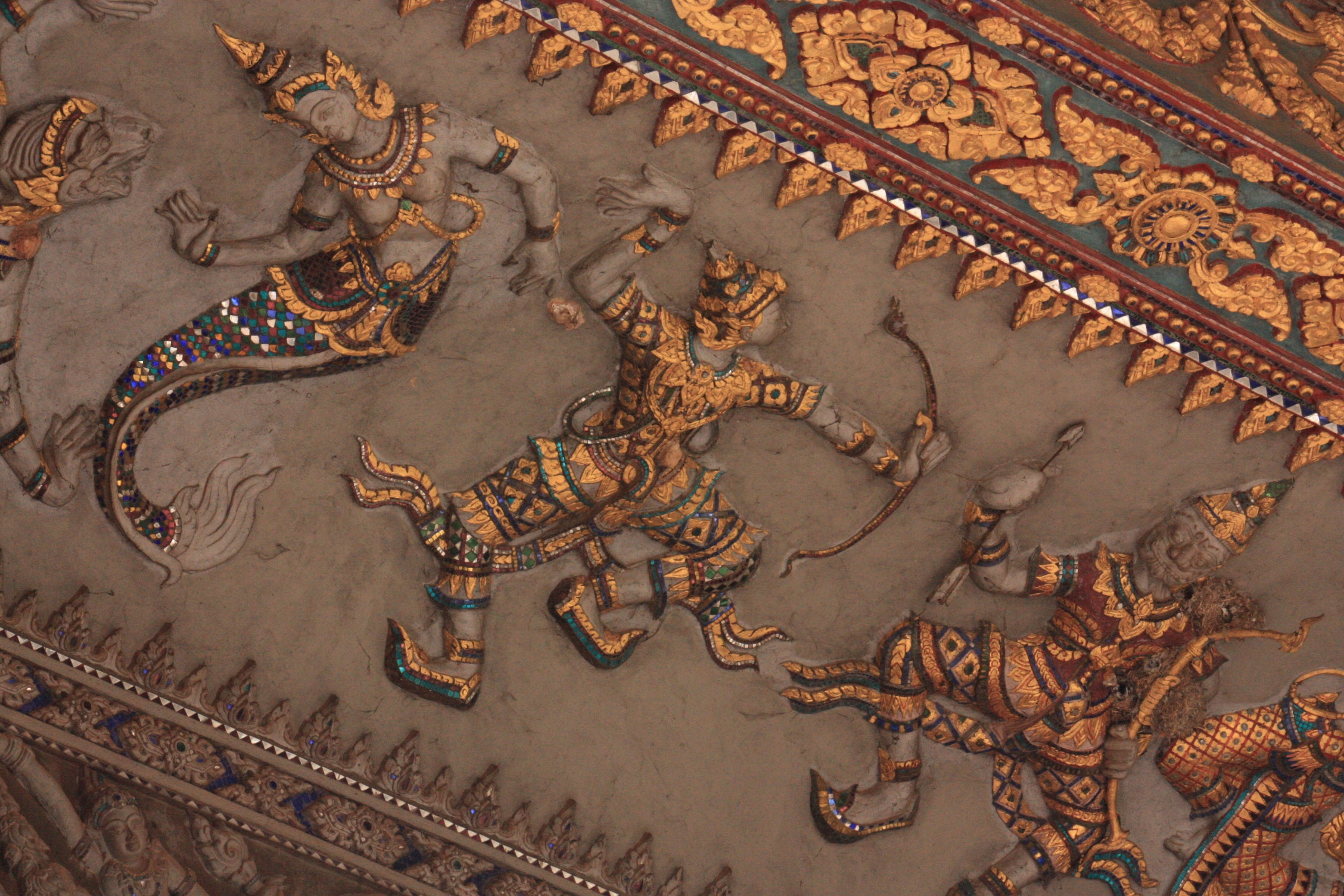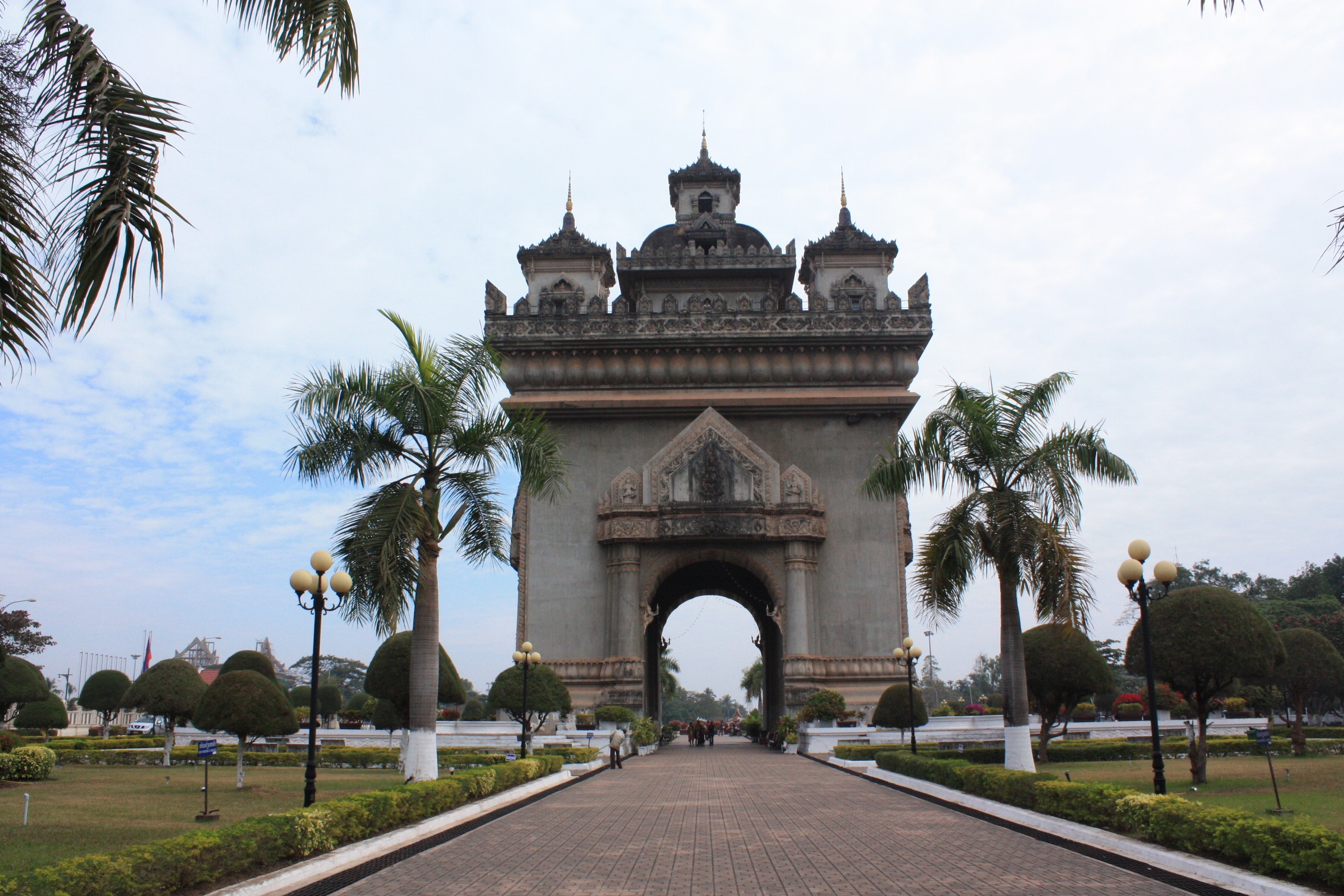 Après ce temple, nous nous rendons à l’arc de triomphe laotien, le Patuxai, commémorant les morts des différentes guerres. Pour la petite histoire, le béton, donné par les américains, devait servir à la construction d’un aéroport. Nous trouvons que le panneau explicatif de ce monument, rédigé par la commune, est un peu brutal, qualifiant ce dernier de gros bloc inesthétique. Pour notre part, nous ne le trouvons pas si hideux que ça, avec de jolies peintures et sculptures, mettant en scène la mythologie laotienne.