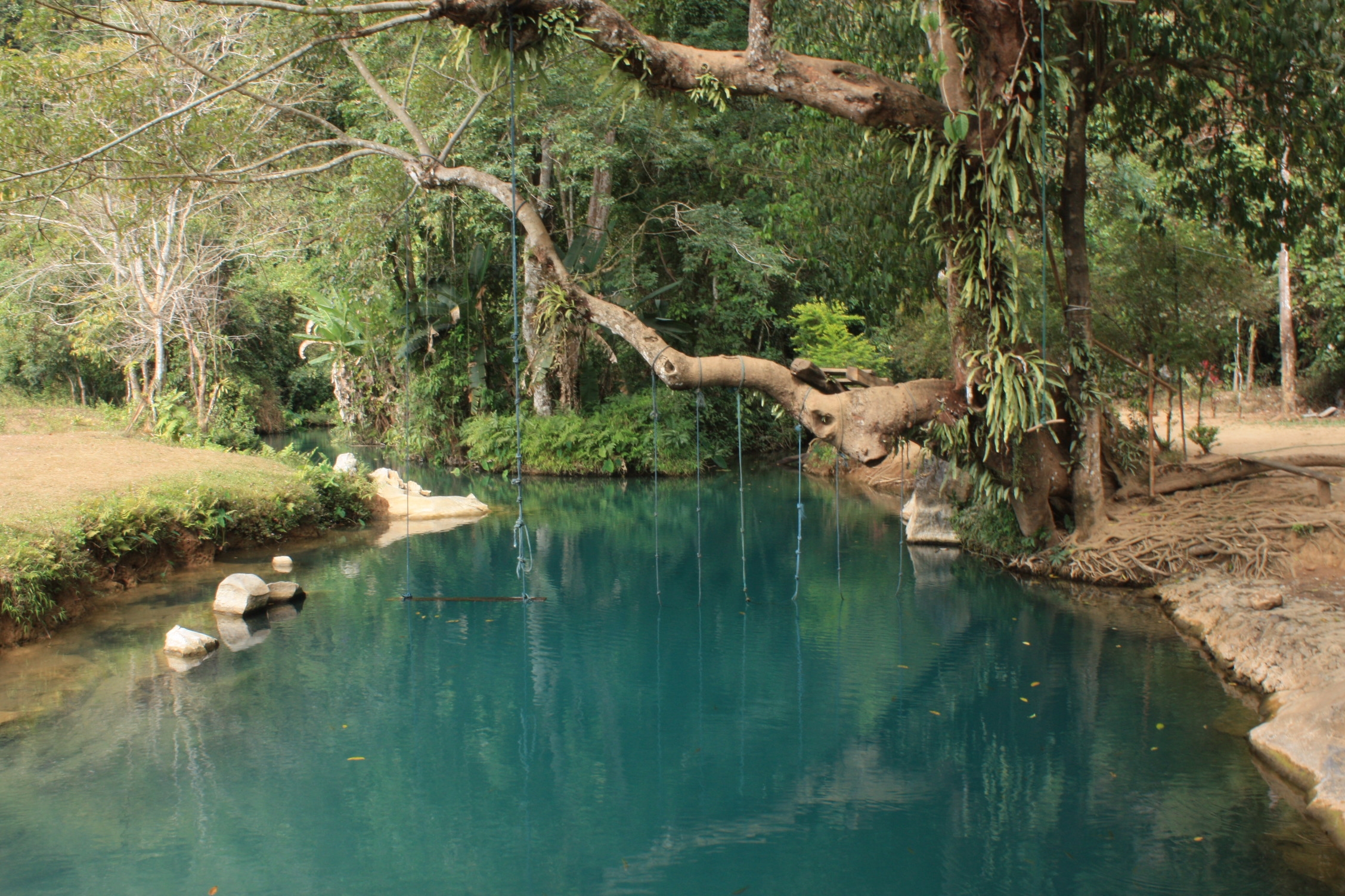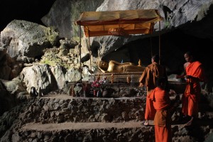 Pour profiter au maximum de ces paysages, nous enfilons nos chaussures de marche, et armés du plan de la région, nous partons à l’assaut de quelques unes de ces grottes. Sur le chemin de la première que nous souhaitions voir, nous tombons sur un petit bonhomme d’une dizaine d’années, et d’un panneau écrit dans un très mauvais anglais, demandant de payer un droit de passage de 10 000 kips par personne (soit environ 1€). Ce n’est pas que le prix soit excessif, ni même le fait que l’accès aux grottes soit payant qui nous contrarie, mais plutôt le fait que tous les « péages » soient indiqués sur le plan, à l’exception de celui-ci. Nous flairons donc l’arnaque d’une famille de locaux et nous rebroussons chemin, direction la grotte Tham Poukham. Celle-ci se visite à la lueur d’une lampe torche et de la lumière naturelle et expose un boudhha couché. Elle est située au dessus d’un petit lac à l’eau bien bleue, dans laquelle on peut se baigner. C’était d’ailleurs un peu notre intention, après ces quelques km de rando sous un grand soleil, mais en voyant des individus de la faune précédemment détaillée, sautant dans l’eau dans un joyeux brouhaha, nous en perdons l’envie. Après leur journée tubing, ceux-ci viennent en effet jusqu’ici en scooter. Zut!