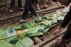 Ce qui a également ajouté du charme à ce trek est l’organisation des guides. A chaque repas, ils nous ont concocté des petits plats typiques (qu’ils ont mis un temps fou à cuisiner!), qu’ils dressaient sur des tables de compétition, avec les moyens du bord. Nous avons donc mangé sur des feuilles de bananiers, avec des baguettes faites en bambou, au couteau, juste avant le repas, ou directement avec nos doigts, à la bonne franquette, comme de vrais locaux!!