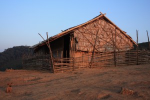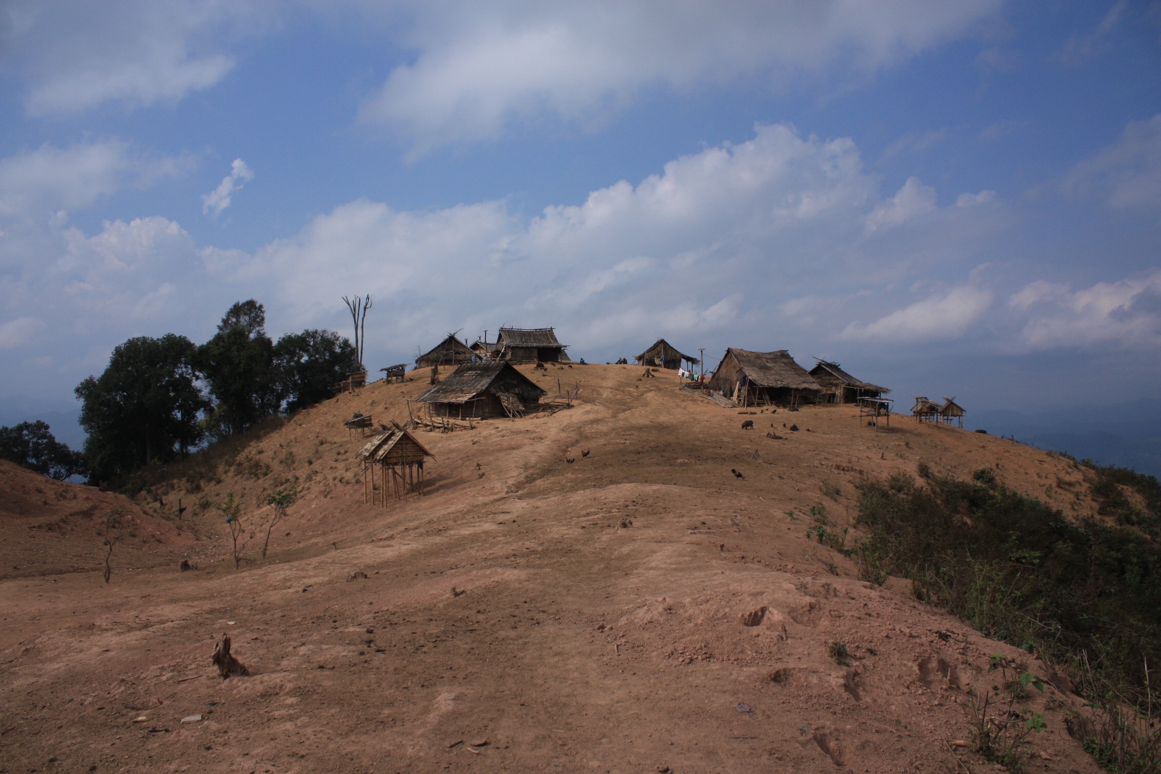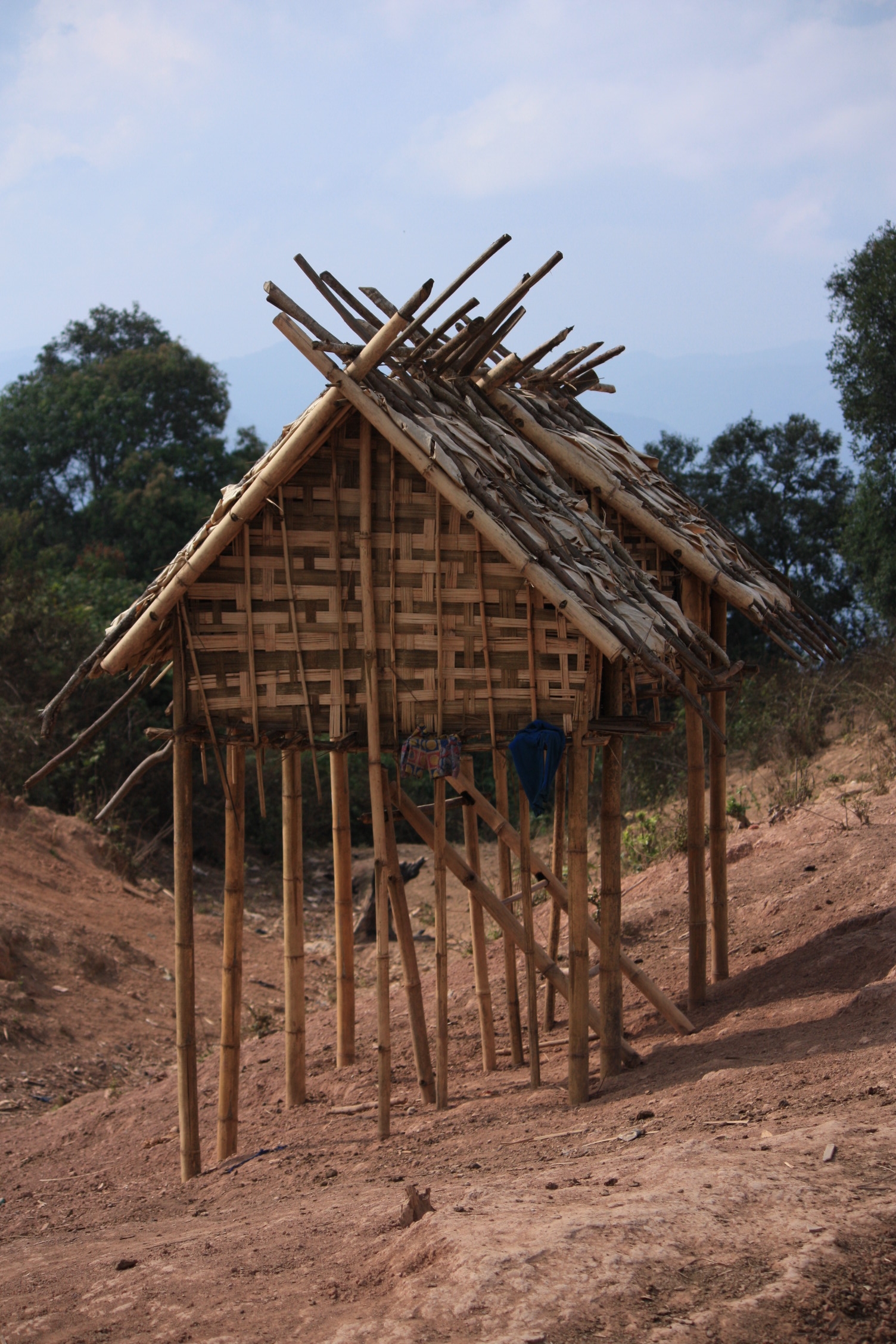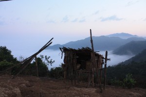 Nous sommes arrivés vers 14:30 dans ce minuscule village, encore très peu visité par les touristes. En premier lieu, nous nous sommes sentis de trop, tels des invités arrivés trop tôt, comme l’a très justement fait remarqué quelqu’un du groupe. Mais petit à petit, la curiosité a pris le dessus et les villageois se sont approchés. Au matin de notre départ, un petit attroupement s’est même créé pour nous regarder nous mettre de la crème solaire et dézipper le bas de mon pantalon a été un véritable succès chez ces dames, qui ont finalement bien plus parler de nous entre elles, que nous avons pu parler d’elles entre nous! Il est difficile de retranscrire ce que nous avons ressentis durant cette après-midi et soirée mais nous avons l’impression d’avoir découvert un bout du monde. Ce village au sommet d’une petite montagne, offre un panorama magnifique sur les forêts et les montagnes des alentours. Il regroupe une quinzaine de petites maisons en bambou et évidemment, nous étions prévenu qu’il n’y avait ni l’eau courante, ni l’électricité, ni même de toilettes.