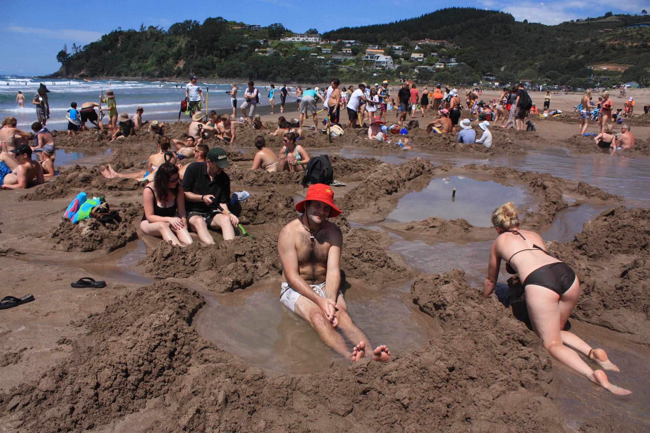 Sur la plage de Hahei, se trouve une source d’eau chaude. A chaque marée basse, cette sortie d’eau de source étant à découvert, des dizaines de personnes prennent possession de ce petit bout de plage, pour y creuser des trous et obtenir ainsi une piscine d’eau chaude, dans laquelle ils se prélassent. Alors que la plage est quasiment déserte, l’eau étant encore une fois trop fraiche pour être appréciable, 2 zones sont noires de monde, à la façon de la Côte d’Azur. Nous décidons nous aussi de profiter de phénomène et nous tentons de nous attribuer un trou abandonné. Malheureusement, ces trous sont vides pour une bonne raison, bien qu’à proximité d’autres trous occupés, ceux-ci sont remplis d’eau froide. Il nous faudra un moment pour trouver un emplacement stratégique pour bénéficier d’une eau chaude mais non brûlante, car en effet, au niveau de la sortie de la source, l’eau atteint les 65°C! Comme nous nous refusions de payer 5$ pour la location d’une pelle, André nous a creusé un trou l’aide de ses blanches mains, avec entrée d’eau chaude et sortie d’eau rafraichie, rien de moins!! Finalement, nous n’avons pas passé plus de 10 minutes les fesses dans l’eau et nous offrons notre trou à une blonde (celle dont on voit les fesses), qui creusait sans succès un trou à côté du nôtre.