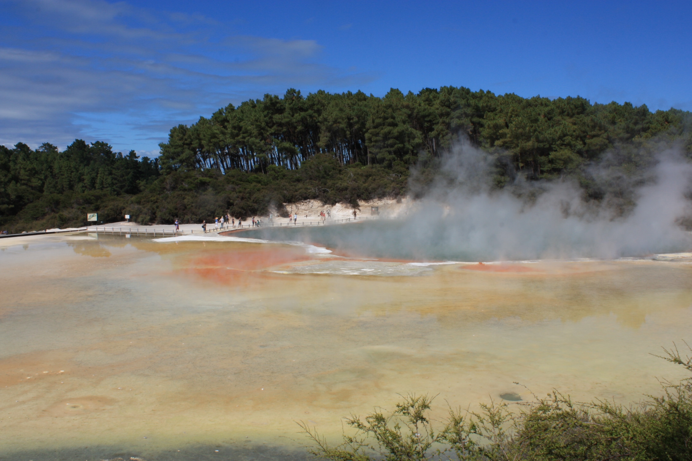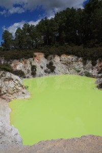 Le lendemain, nous visitons un autre site dans la même région, à Wai-o-tapu (ou « Eaux Sacrées »), qui est le site volcanique le plus coloré et diversifié de nouvelle-Zélande. Cette zone de 18 km2, déclarée réserve naturelle, est la plus grande zone d’activité thermale de la région volcanique de Taupo. Et en effet, même si nous ne voyons qu’une petite partie de cette zone, nous sommes impressionnés, par tant de cratères, grottes, piscines, fumerolles, mares de boue et par tant de couleurs, notamment par ce qu’ils nomment « la palette de l’artiste », une vaste étendue parsemée de tâches (de sorties d’eau) dont les couleurs varient en fonction de la température de l’eau et en fonction des niveaux d’eau, et de la direction du vent. Ces teintes sont jaune (soufre), orange (antimoine), blanc (silice), vert (arsenic), rouge-brun ( oxyde de fer), noir (soufre et carbone) et violet (manganèse). Nous nous promenons ainsi pendant 3 heures, passant d’une grotte de soufre au « bain du diable » (un grand cratère aux contours déchiquetés contenant une eau plus ou moins verte selon la quantité d’arsenic), en passant par les « encriers du diable » (petites mares d’eau très noire bouillonnante). C’est superbe, malgré la chaleur du soleil et de l’humidité ambiante due aux vapeurs d’eau.