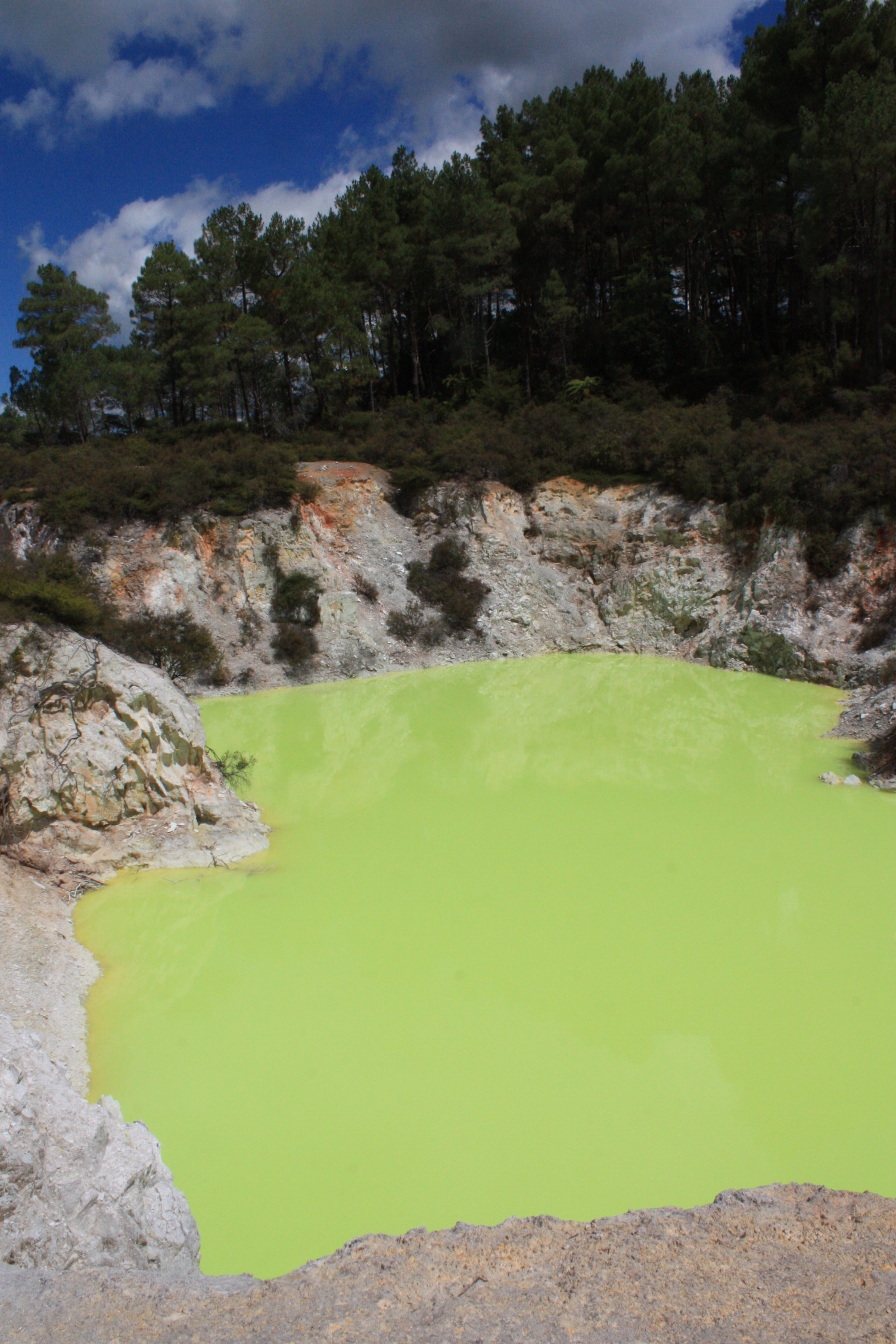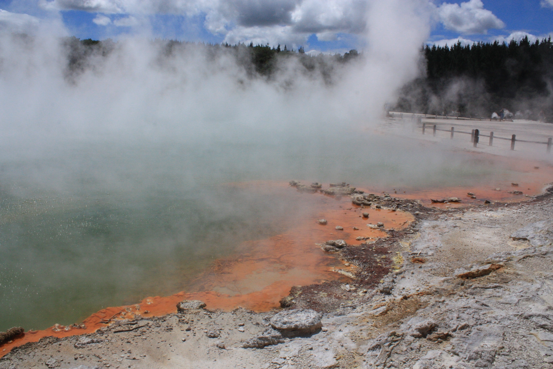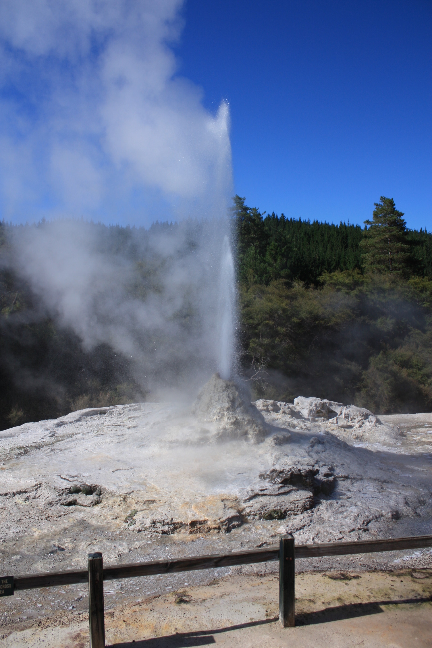 Le geyser a 2 chambres d’eau: la plus haute est remplie d’eau froide car ayant une large ouverture sur le dessus, et la plus basse, d’eau chaude. Le savon déclenche une réaction chimique, permettant le mélange de ces 2 chambres d’eau, faisant jaillir le geyser. Il est un peu moins impressionnant que celui de Te Puia (il ne gicle « qu’à » 20 mètres), mais il est quand même très joli!