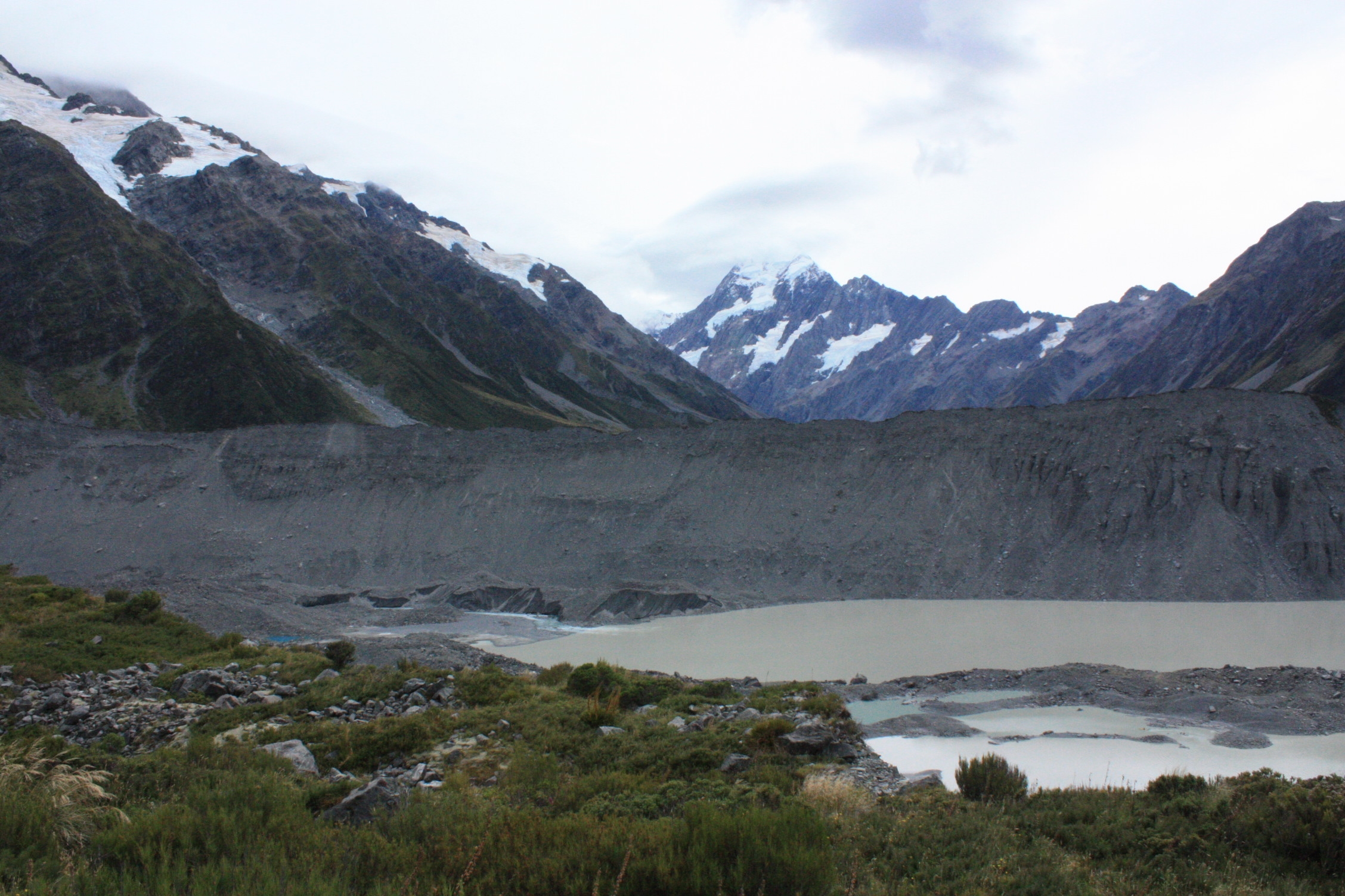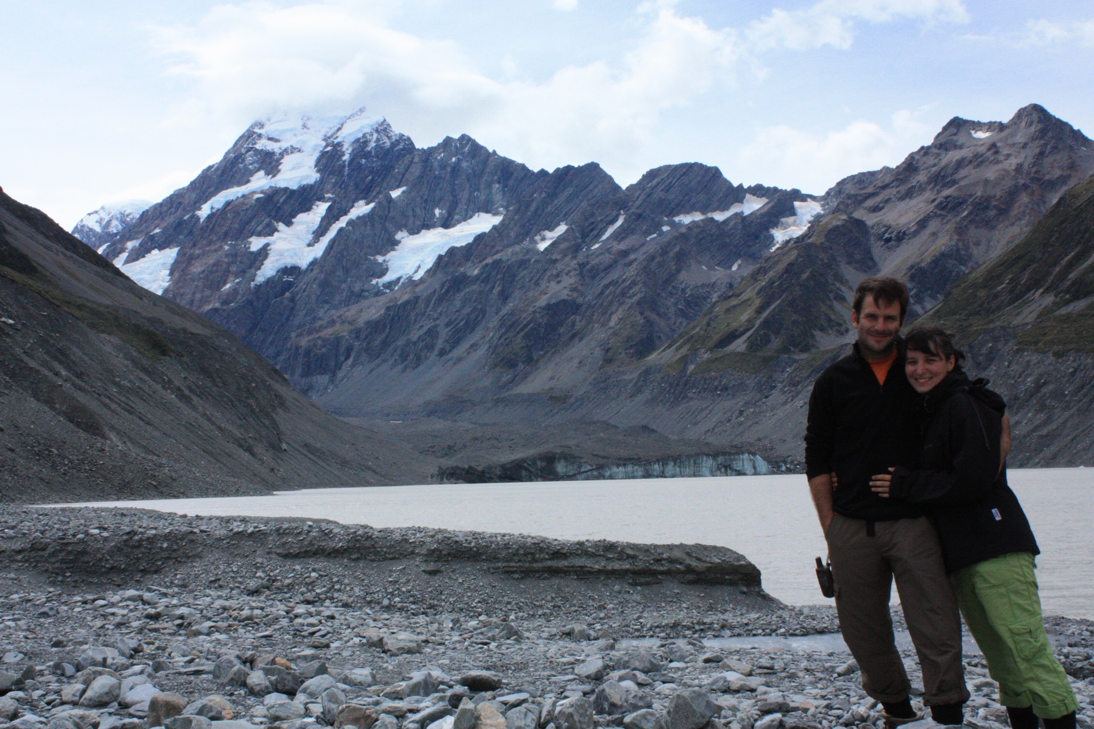Nous enchaînons ensuite avec une petite randonnée de 3 heures dans la vallée Hooker, afin de voir le glacier du même nom et son lac. Bien que lui aussi soit recouvert de graviers, il est tout de même plus impressionnant que celui de Mueller, avec ses 11km de long.