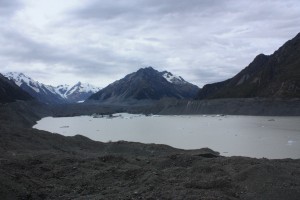 A la place, nous faisons 3 petites randonnées, à partir du village Mont Cook. La première petite marche d’une heure, nous amène au point Kea, d’où on est sensé apercevoir le glacier Mueller. Malheureusement, une fois sur place, nous constatons que celui-ci a quasiment tout fondu: nous ne voyons en fait que son lac et sa moraine latérale, vestiges d’un passé plus glorieux. Après analyse au zoom de mes photos, je remarque tout de même une petite masse que nous pensons être le reste du glacier, recouvert de graviers.