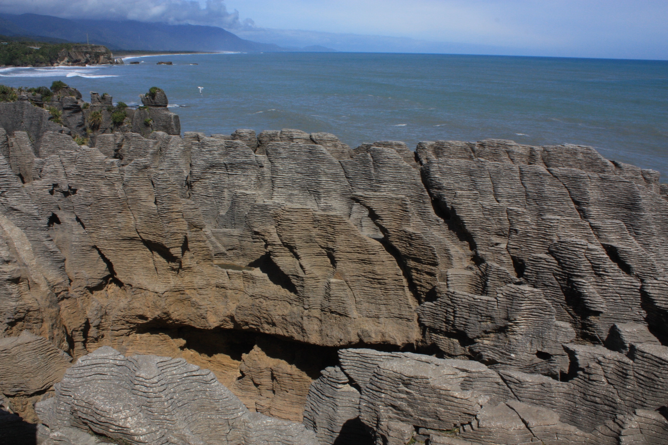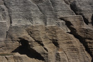 Nous continuons notre remontée vers le nord. Notre première étape est Punakaiki et ses célèbres Pancakes Rocks. Comme leur nom le suggère, il s’agit d’un empilement de pierres plates, qui ressemble effectivement à un tas de crêpes. Issue d’une région calcaire, cette formation rocheuse est le résultat de l’action de très hautes pressions, sur une alternance de couches dures et molles, de sédiments d’animaux marins et de plantes.