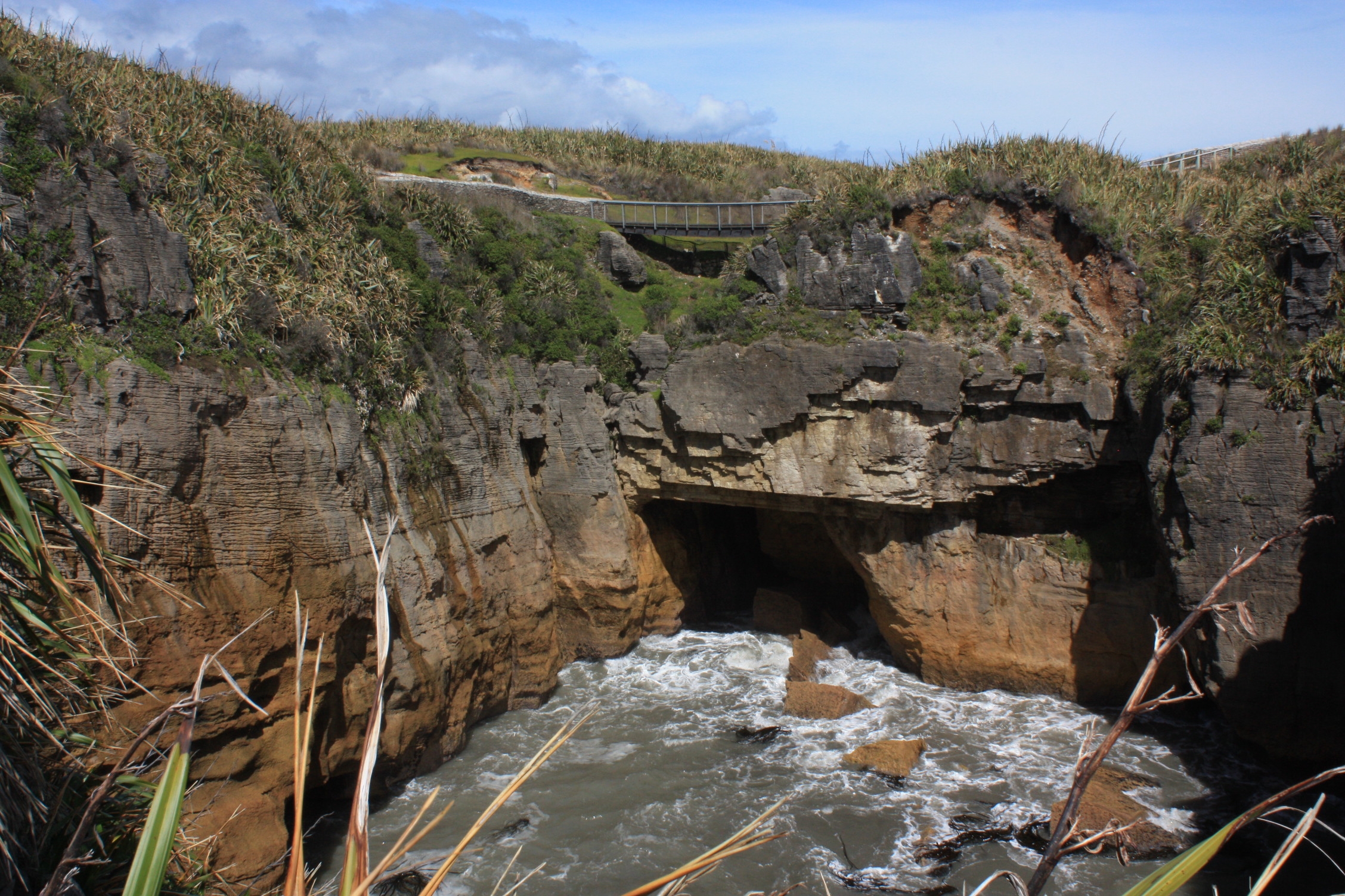 Avant de nous y rendre, nous prenons soin de nous renseigner sur les meilleurs horaires pour voir le blowhole (= un trou dans la roche par lequel s’engouffrent les vagues, et giclant comme un geyser marin) du site, qui varient évidemment en fonction de la marée. Le timing est parfait, mais « malheureusement », en nous dirigeant vers le nord, nous avons par la même occasion (enfin!) retrouvé le beau temps: il n’y a donc plus assez de vent pour faire de belles vagues et le blowhole ne souffle pas le moins du monde! Dommage donc, mais nous sommes bien ravis de pouvoir quitter nos collants en laine! Nous profitons tout de même de la beauté du site, les touristes étant du coup, moins longtemps agglutinés!