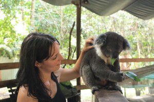 Une fois véhiculés, et sur les conseils de Julien, nous nous dirigeons au nord ouest de Sydney pour visiter le parc du Sanctuaire des koalas. Bien moins cher que le zoo, il présente des espèces endémiques comme les échidnés, wombats, grand nombre d’oiseaux, et évidemment, kangourous et koalas. Le petit plus, c’est que nous avons la permission de papouiller un koala, un mâle (les mâles sont reconnaissables grâce à la grande trainée marron sur leur torse, car ceux-ci frottent la glande qu’ils ont à cet endroit, contre le tronc des eucalyptus pour marquer leur territoire), à moitié endormi qu’il a fallu tenir éveillé le temps des photos, avec des branches d’eucalyptus. Il faut savoir que ces grosses peluches passent entre 18 et 20h de leur journée à dormir,et le reste du temps, elles mangent!