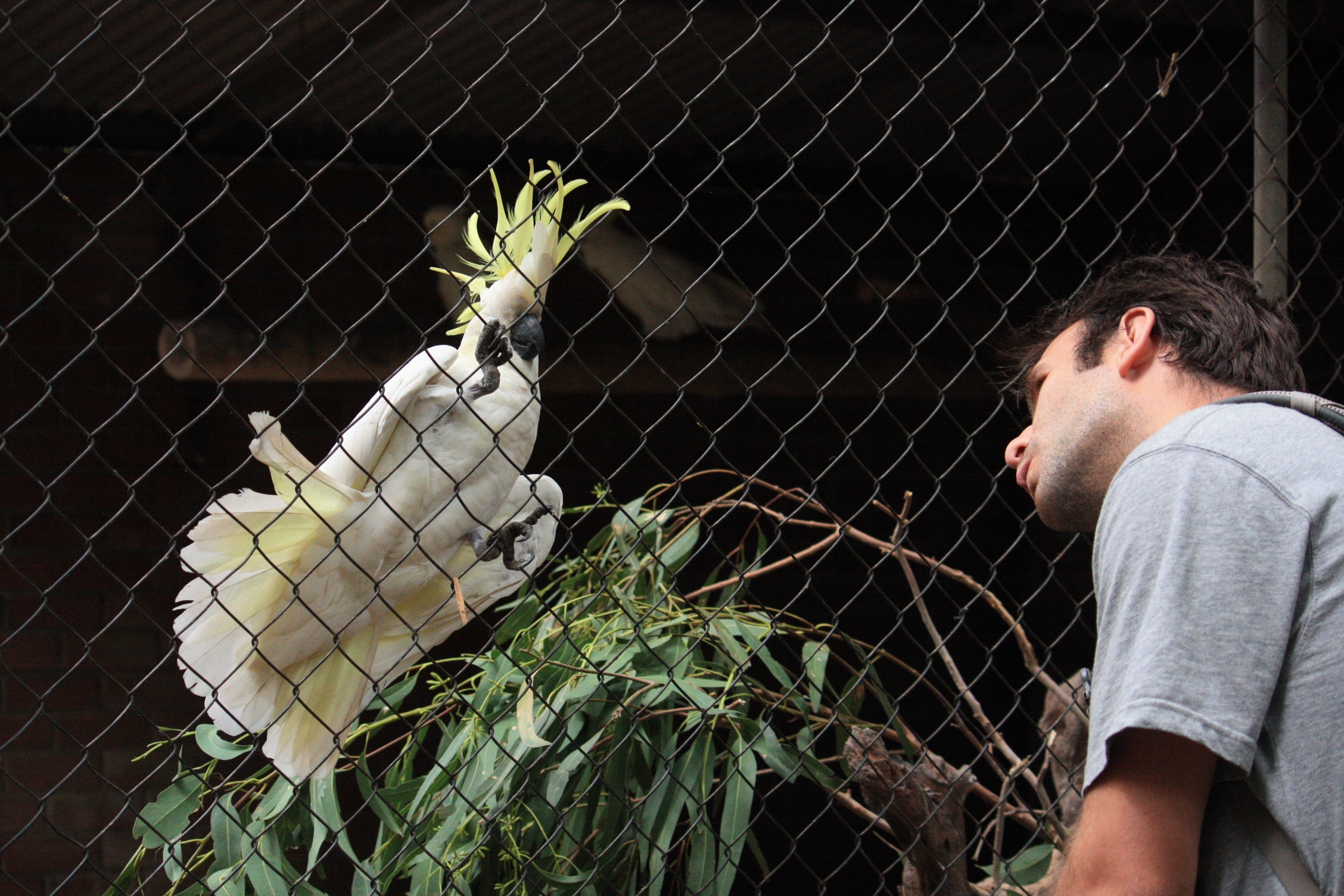 André faisant la conversation à un cacatoès à huppe jaune, nous saluant et nous demandant des crackers!