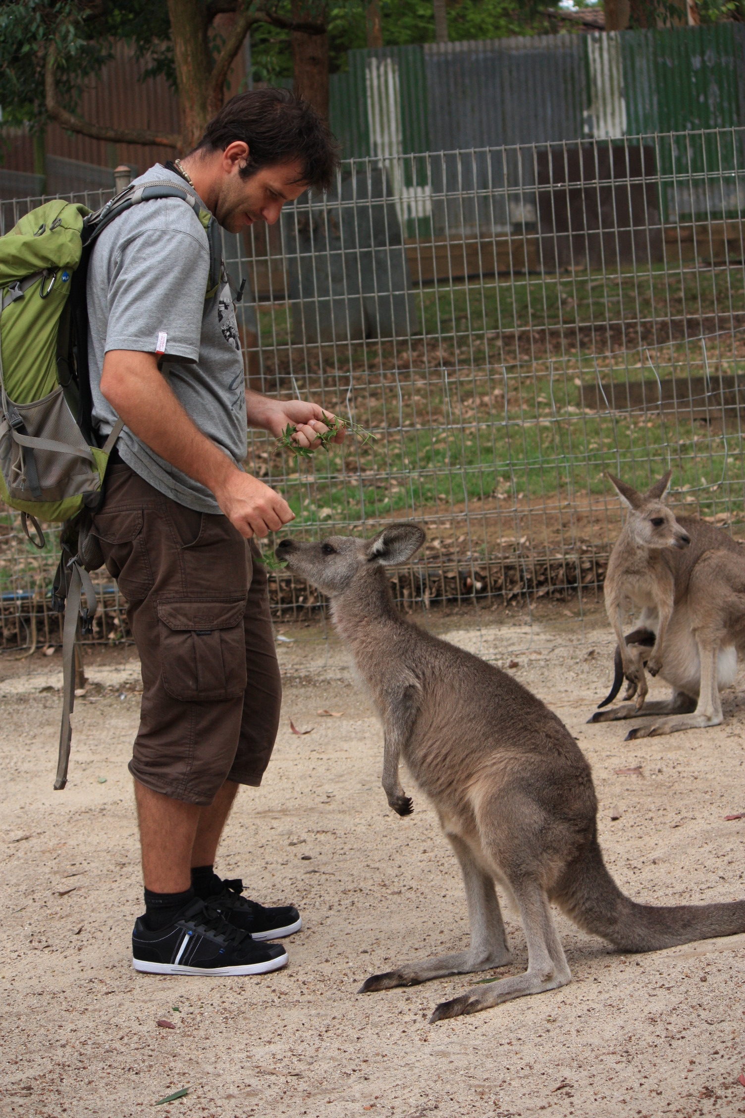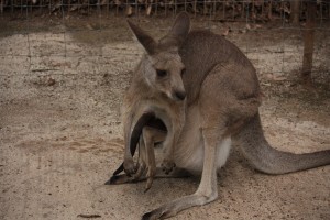 Nous passons également du temps dans l’enclos des kangourous gris, que nous nourrissons et caressons. Ce ne sont les plus grands des kangourous (il s’agit des kangourous rouges), mais se retrouver entourés d’une quinzaine de bêtes, qui une fois sur leurs pattes arrières, font plus d’un mètre de haut, ça reste impressionnant! Nous sommes chanceux, certaines femelles ont encore leur petit (plus si petit que ça d’ailleurs!), dans la poche, et nous arrivons même à caresser l’un d’eux.