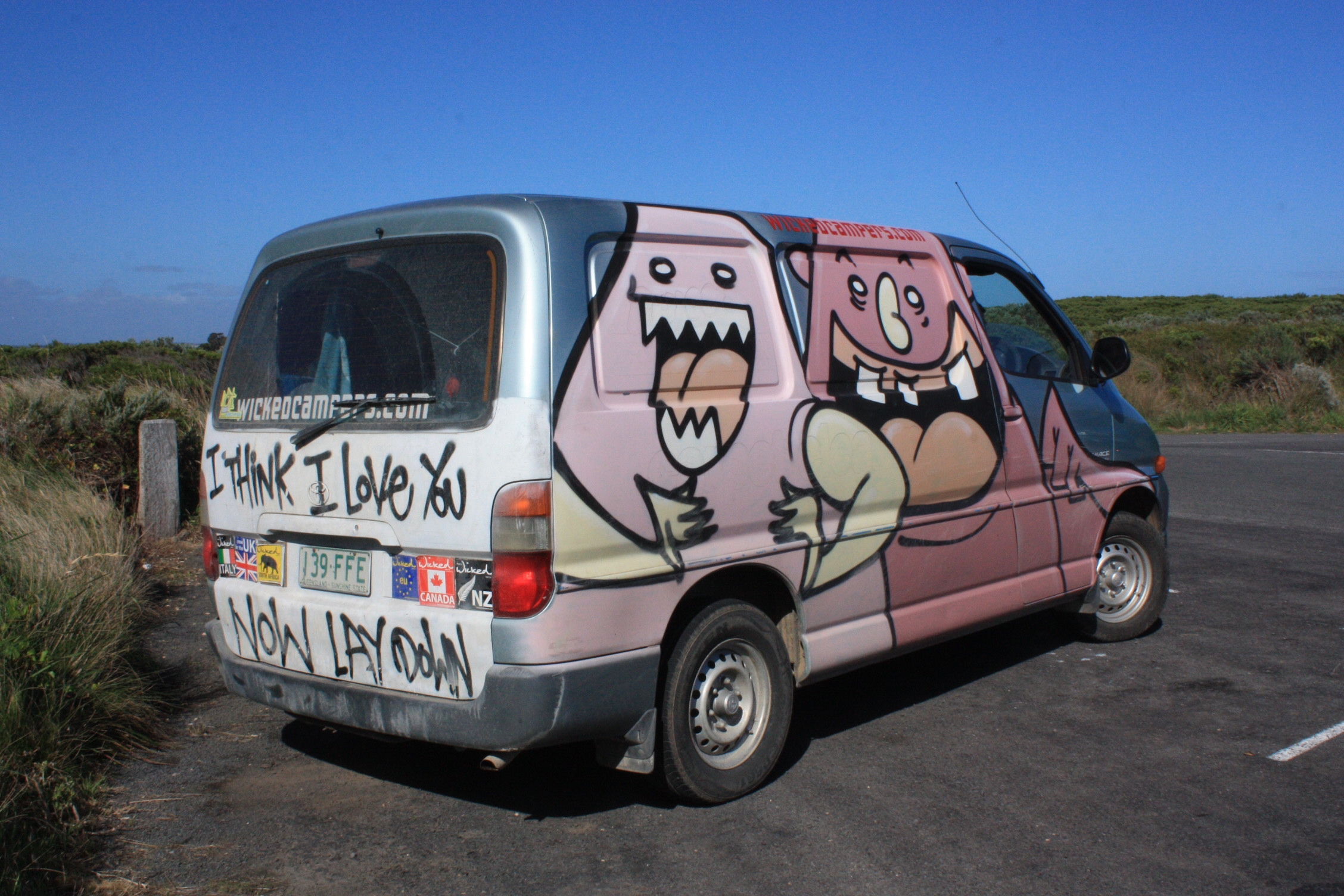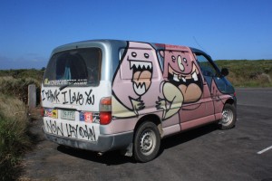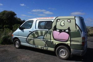 Après 2 jours à Sydney, nous récupérons enfin notre nouveau van et au départ, la douche fut froide: nous qui avions demandé un véhicule récent pour ne pas être embêtés par des problèmes techniques au cours des 4 mois à venir, nous nous retrouvons avec un van encore plus vieux que celui de Nouvelle-Zélande, avec déjà 400 000 kms au compteur…Il s’agit d’un ancien van de laveur de tapis! Les points positifs: il est légèrement plus grand que Mad, et les dessins dessus ne sont pas trop moches, bien que le message soit bien macho! L’agencement est le même qui précédemment.