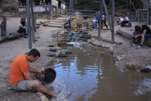 Evidemment, un tel village ne va pas sans une rivière, dans laquelle se trouve de l’or! Nous passons une grosse heure, les mains dans l’eau, à imiter les orpailleurs rencontrés au nord du Cambodge, à Banlung. Et dans chaque pelletée de sable/graviers, nous extrayons, très fièrement, quelques mini-pépites, enfin, avouons-le, quelques paillettes d’or plutôt. Il paraitrait que nous avons trouvé l’équivalent de peut-être 3 bières! Mais bon, il faut tout de même savoir que 70 000$ d’or sont dispersés chaque année dans cette rivière, afin de réjouir les visiteurs, et ça marche: nous sommes comme des gamins, tout heureux des petits grains dorés, au fond de notre coupelle!