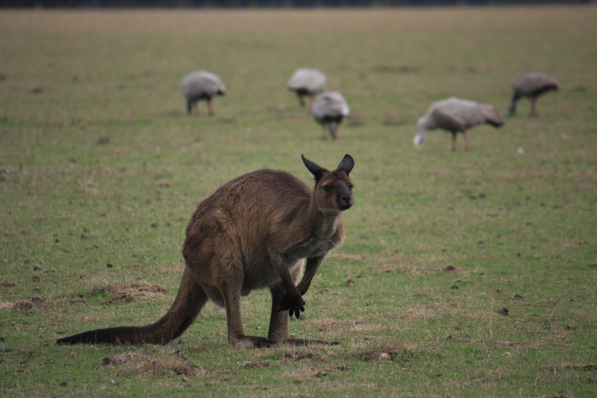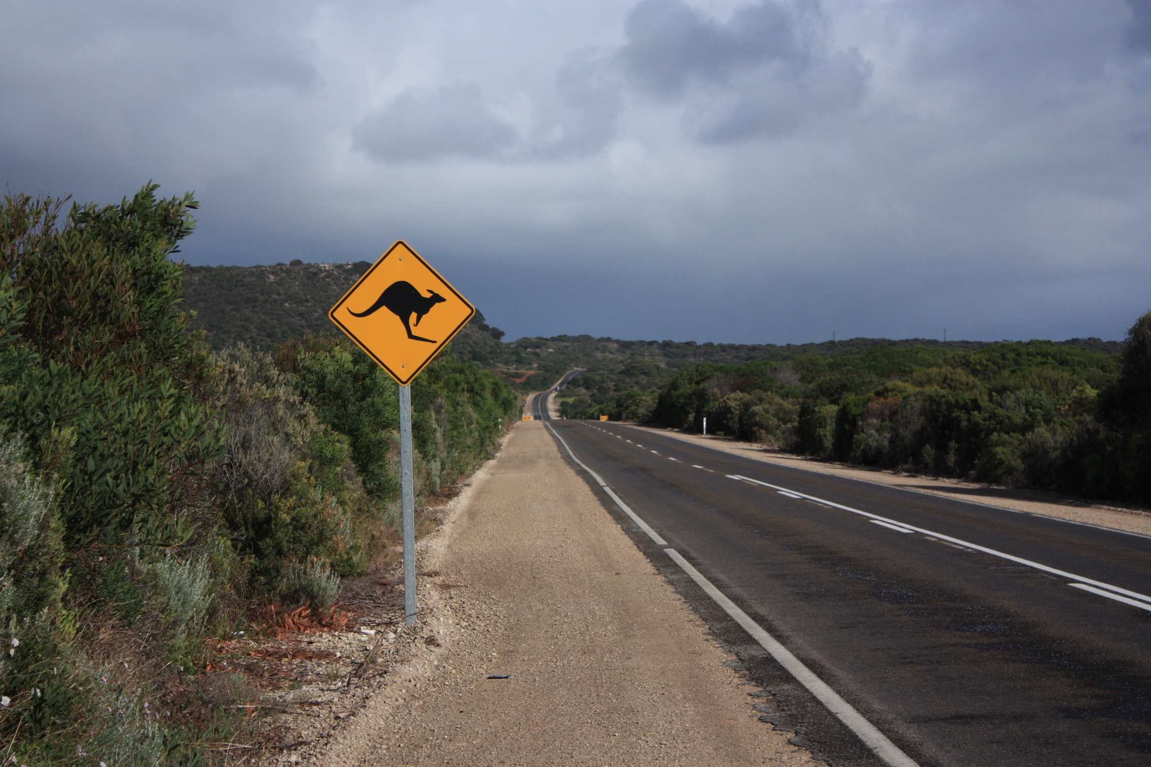 Après le pique-nique où nous sommes harcelés par des Magpie qui voudrait bien leur part de croque-monsieur au barbecue, nous sortons du parc pour rejoindre Vivonne Bay, une jolie plage. En route, nous croisons tout de même nos premiers kangourous de l’île, mais malheureusement, ils semblent être dans un pâturage entouré de grillages. Mais où sont donc ces fameux kangourous sauvages, censés pulluler sur ce bout de terre? Il doit pourtant y en avoir beaucoup si nous nous référons à la quantité de cadavres et de carcasses que nous croisons sur le bord de la route. En effet, sans prédateurs, les accidentés de la route se décomposent bien doucement, et ce n’est pas les tas d’os qui manquent!