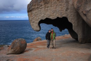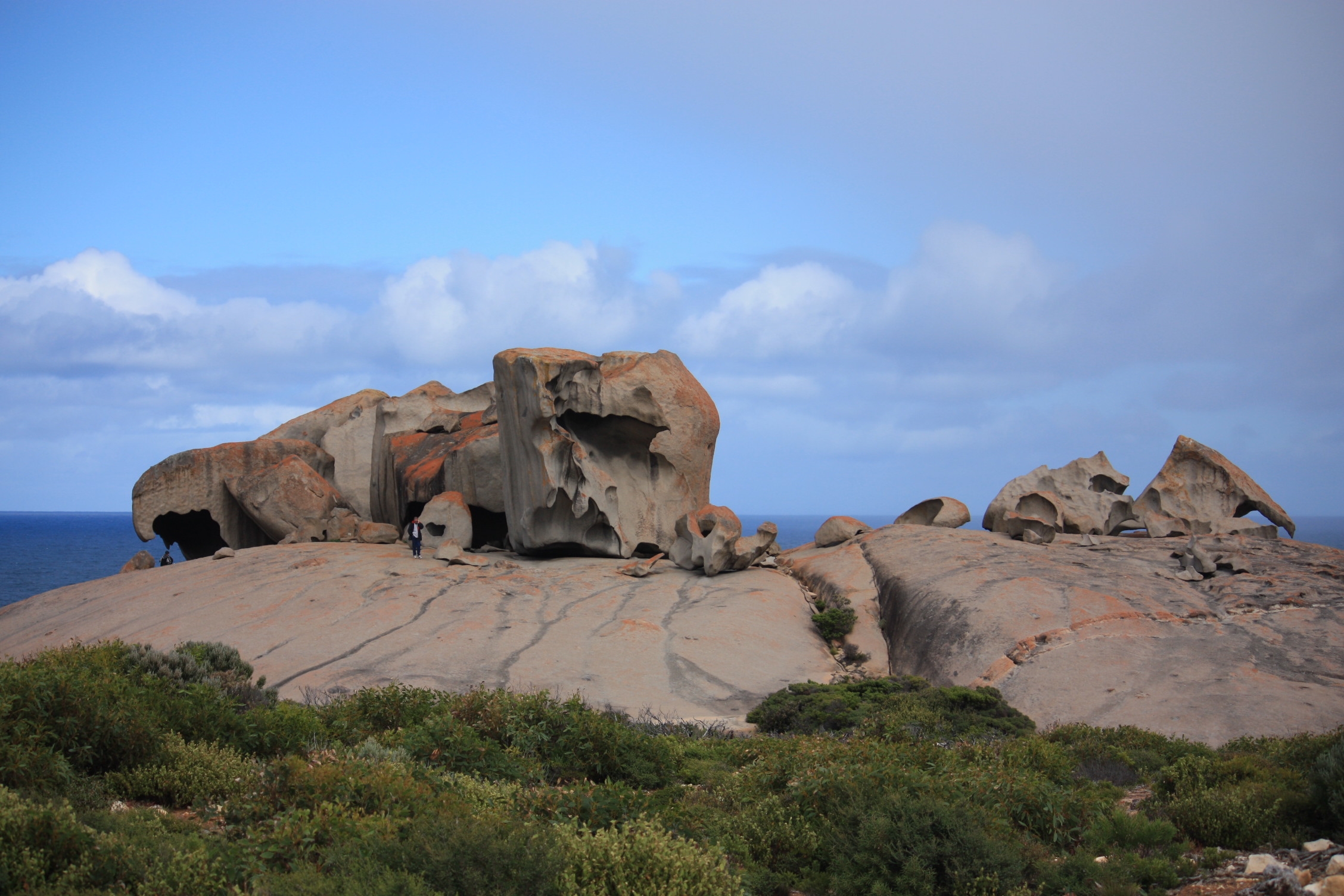 Nous nous rendons ensuite aux Remarkables Rocks, de grosses billes qui semblent posées sur un rocher lisse, au dessus de la falaise. Celles-ci ont été formées de la même manière que le fameux Ayers Rock que nous verrons plus tard dans le désert. Il y a plus de 500 millions d’années, une poche de magma remonta jusqu’à une dizaine de km de la surface de la terre, qui en refroidissant très doucement, se fractura en couches. Au fil du temps, les couches sédimentaires à sa surface se sont érodées, laissant apparaître le dôme magmatique, lisse par rapport aux alentours. La première couche de magma exposée subit alors des infiltrations d’eau, selon des fractures verticales, formant ainsi ces blocs granitiques. Lorsque ceux-ci seront totalement érodés, la couche suivante subira le même sort. Ces roches aux formes particulières sont de plus, recouvertes d’un lichen orange du plus bel effet.