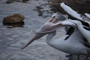 Nous sommes en avance par rapport aux horaires indiqués dans le guide, et heureusement car, en fait d’un véritable nourrissage, nous voyons arriver un pêcheur, un seau rempli de déchets de poissons. Nous n’avons pas le temps de descendre du van que le seau est déjà vide, les pélicans ayant déjà plein de poissons en travers du gosier.