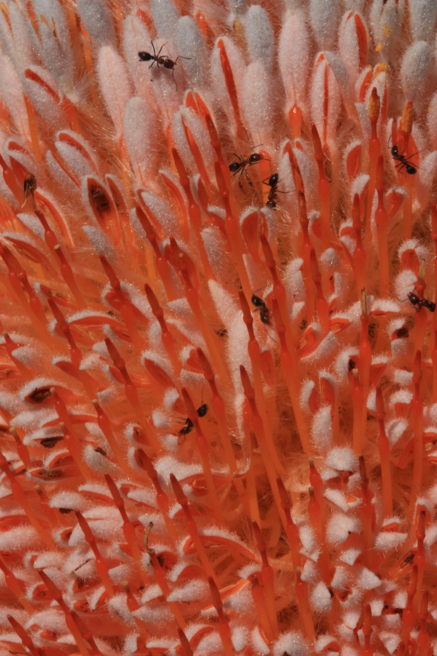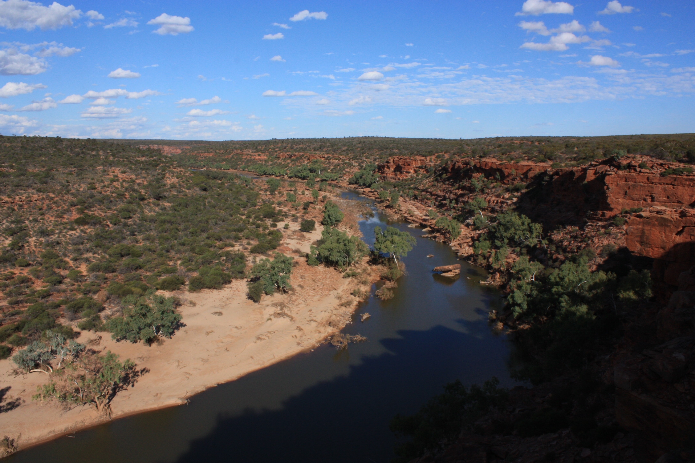 Nous effectuons les quelques kilomètres qui nous séparent encore de Kalbarri, et plus précisément de son parc national, après quelques arrêts points de vue sur les falaises. Ce parc, comme toute la région au nord de Perth, est censée être riche en fleurs sauvages, mais évidemment, ce n’est plus la saison de leur floraison. Seul un arbre arbore toujours de superbes pompons oranges, où les fleurs non ouvertes ressemblent à des coton-tiges!