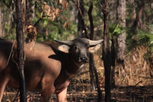 C’est en effet dans ce parc que nous avions de grandes chances de voir des crocodiles, « salties » et « freshies », notamment au cours de croisière d’observation sur la rivière Alligator, mais malheureusement, celle-ci est encore interdite d’accès. Nous ne verrons donc pas de ces reptiles ici. Côté faune, nous croisons tout de même des blacks wallaroos, des fourmis vertes (une espèce typique du Territoire du Nord, dont l’abdomen est vert translucide), 2 dingos et un buffle. Des « buffalos », importés d’Asie du sud-est entre 1839 et 1848, sont en effet redevenus sauvages après s’être échappés. Ils se sont bien adapté et ont proliféré. Des campagnes d’extermination dans les années 1970-1980 en ont cependant éliminé un grand nombre. Toujours élevés pour leur viande de grande qualité, il en reste tout de même quelques uns sauvages, localisés dans Kakadu.