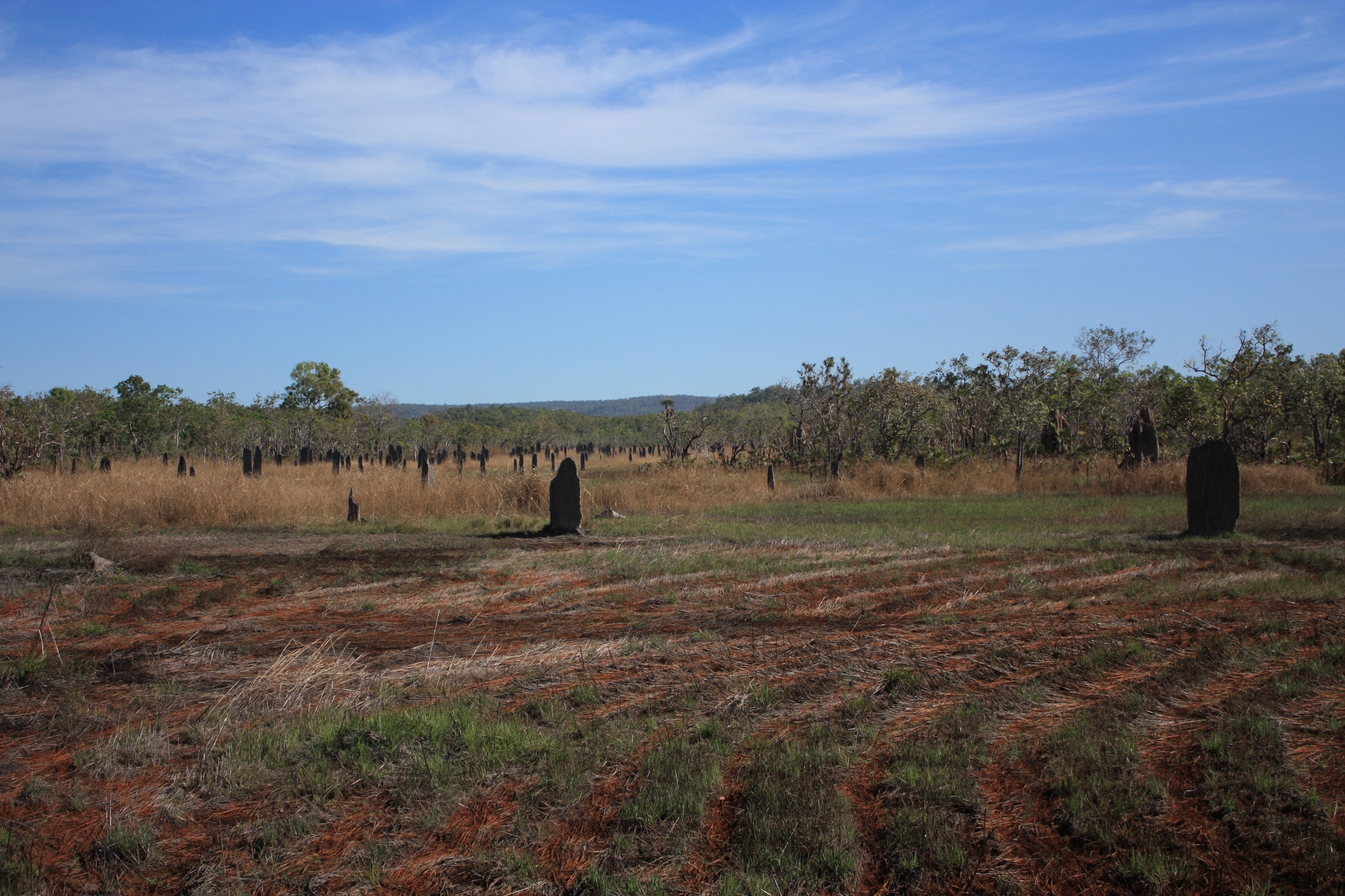 Notre premier arrêt a pour but de voir les termitières magnétiques. A la différence de toutes les termitières vues le long de la route, celles-ci ne forment pas de dôme. Elles sont en effet, plates et surtout, toutes orientées selon le même axe nord/sud. Appelées ainsi parce qu’on pensait qu’elles repéraient le nord magnétique pour construire leur termitière, on sait maintenant que ce n’est que le résultat d’une sélection naturelle: les termitières orientées différemment sont détruites par les éléments, tout simplement!