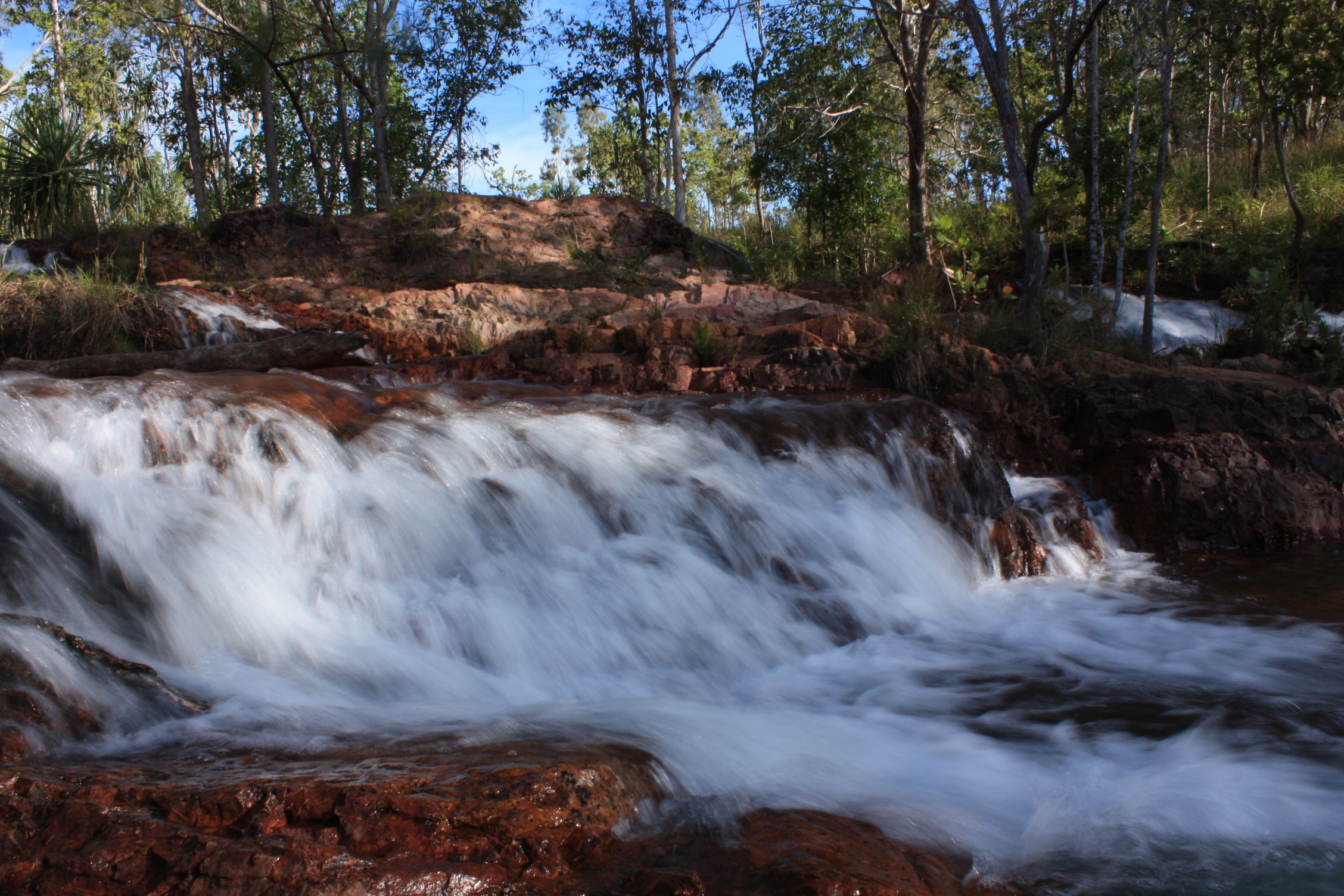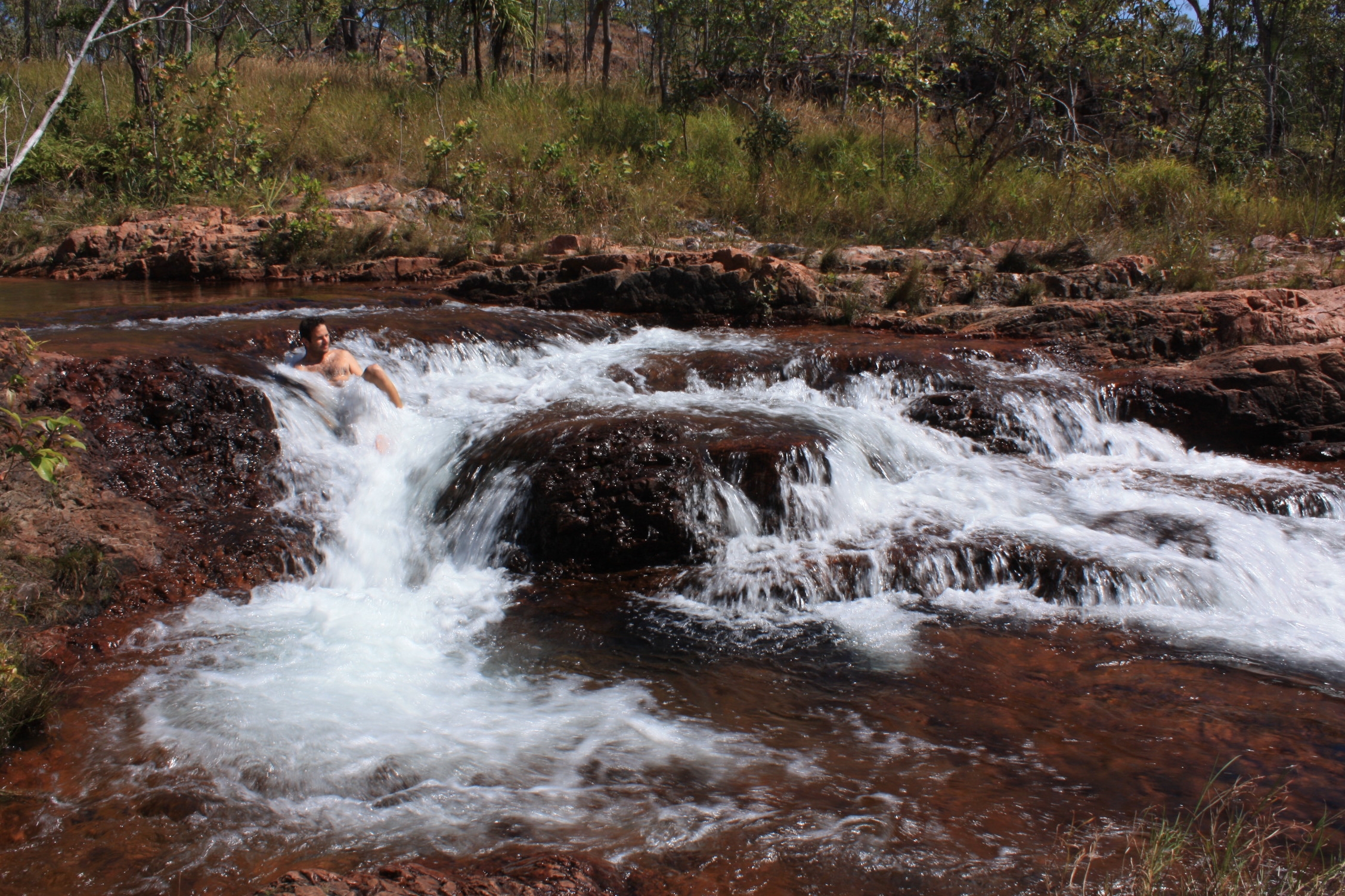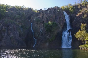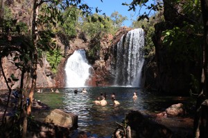Nous nous rendons ensuite au site Buley Rockholes, un enchainement de cascades et de piscines naturelles où, pour notre plus grand bonheur, la baignade est autorisée. En effet, les crocodiles n’ont pas accès à cette zone, du fait des rochers l’entourant. Le site est magnifique et après trempage des orteils, nous décidons de passer la nuit au camping à côté, aux Florence Falls, pour revenir en profiter le lendemain. Pour finir de nous ravir, ce camping possède de véritables toilettes avec chasse d’eau, et des douches avec eau chaude. Nous n’en espérions pas tant d’un camping de parc national!!