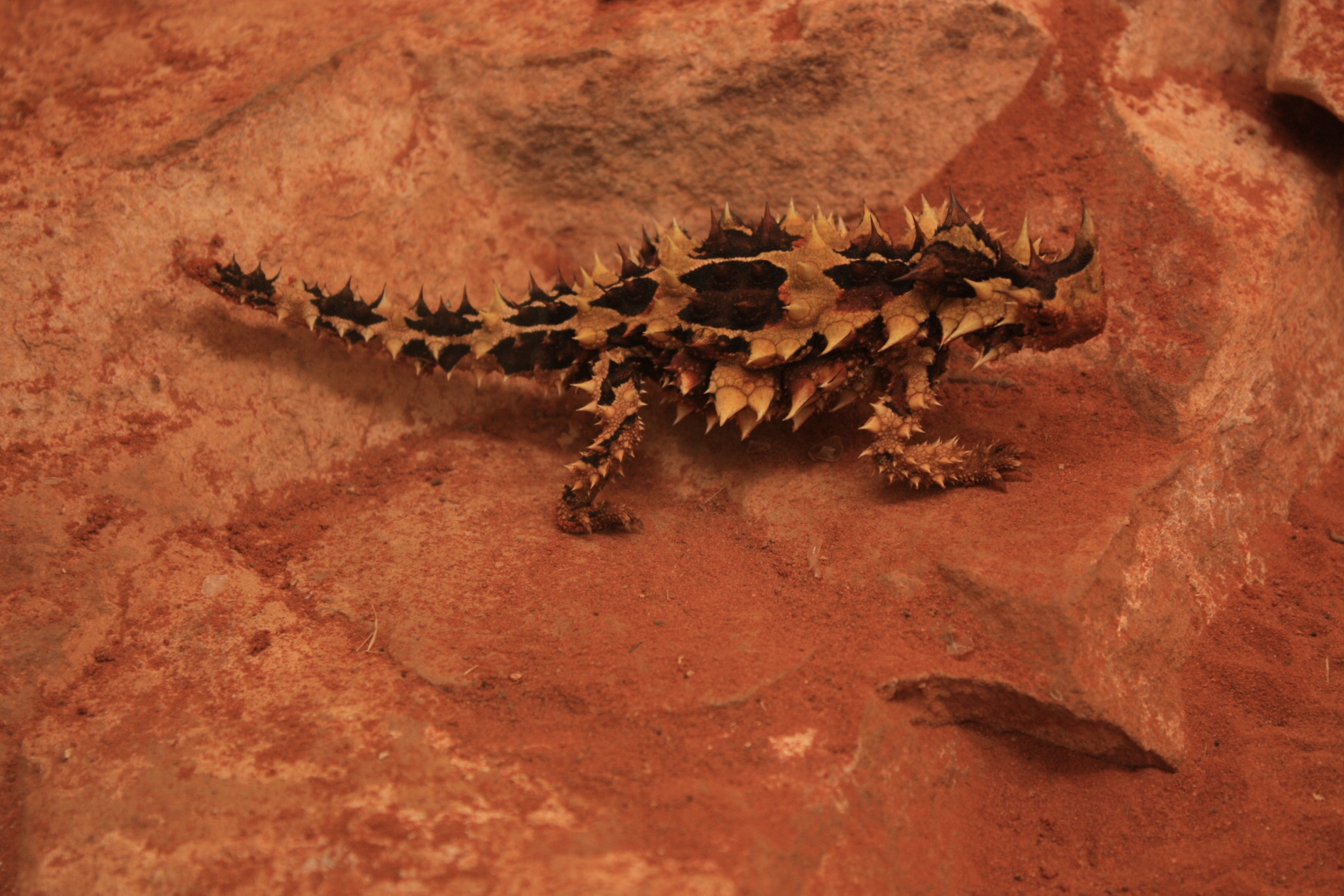 En attendant que le soleil veuille bien réapparaître, histoire de voir Uluru sous un ciel bleu, nous traînons un peu ville, profitons d’internet et faisons le plein de films au vidéo club. Nous visitons également le Centre des Reptiles, un petit centre animalier très familial qui nous a beaucoup emballé. Nous voulions entre autre, voir des thorny devils, des reptiles bien particuliers, jaunes et oranges, avec des piquants sur le dos, ainsi que des lézards frilled, qui arborent une impressionnante collerette lorsqu’ils ont peur. Nous aurions aimé croiser ces 2 animaux dans la nature, mais ils semblent assez difficiles à voir.