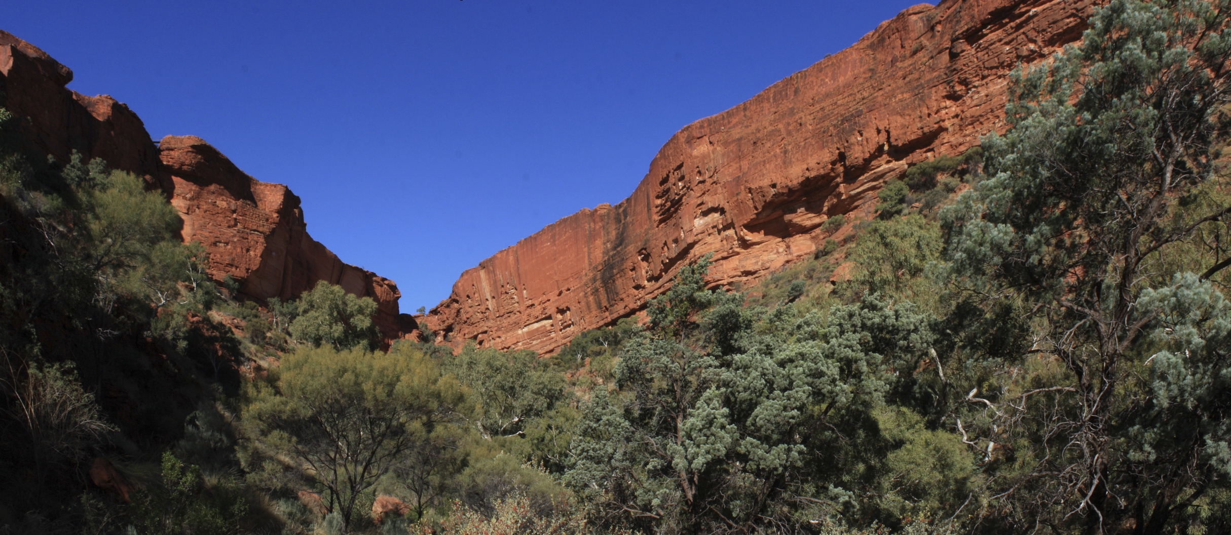 Kings Canyon amorce d’ailleurs bien notre découverte du désert. Les falaises sont d’un rouge profond et ressemblent à celles que nous avions tant aimées dans le parc national de Karijini, en Australie Occidentale. Nous effectuons la petite balade dans le lit de la rivière asséchée au fond de la gorge, jusqu’à l’endroit où les falaises se rejoignent.