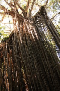 Nous nous arrêtons également voir une curiosité du coin, le Curtain fig tree, un immense arbre dont la croissance est bien particulière. Sa graine germe en effet sur une branche d’un arbre hôte. Ses racines poussent alors jusqu’au sol et en se développant, il finit par courber puis étouffer son hôte, donnant ainsi une structure bien étrange.