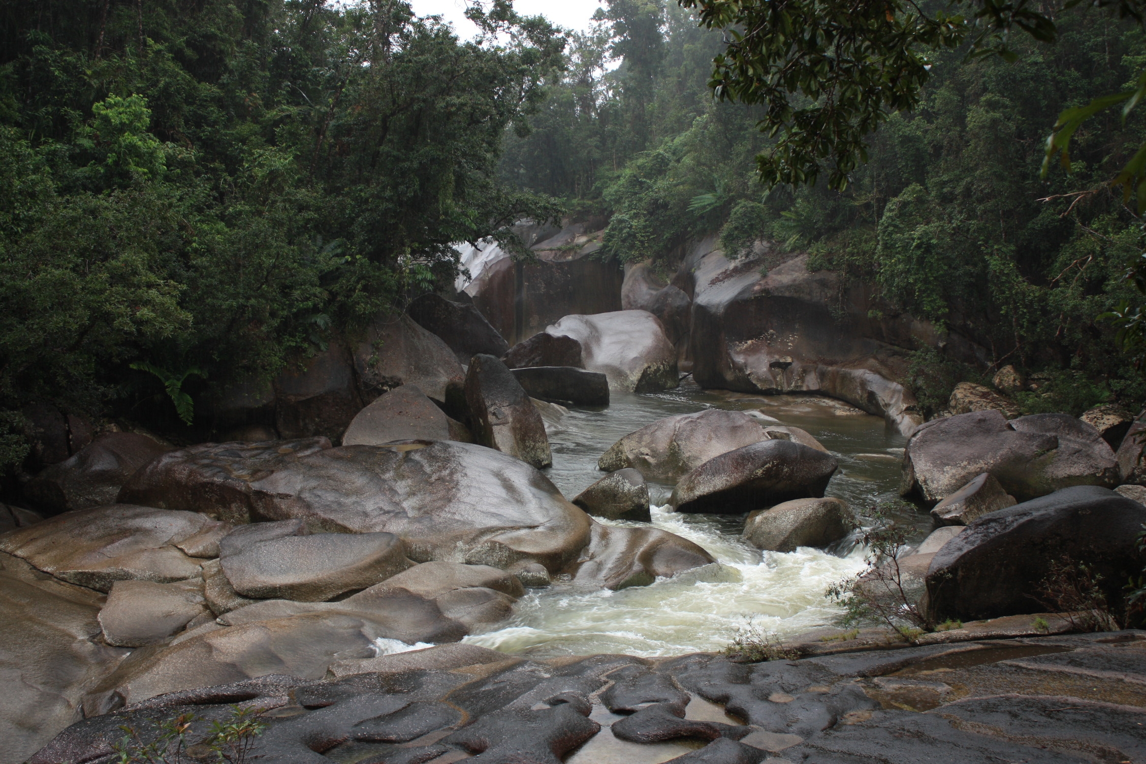 Enfin, même s’il n’y a plus rien de « gros » à voir, la côte est nous réserve tout de même certaines belles surprises. Nous commençons par nous rendre aux Boulders. Comme leur nom l’indique, il s’agit de gros rochers lisses. Ceux-ci se trouvent dans le lit d’une rivière à courants dangereux et malgré la pluie, nous aimons le lieu.