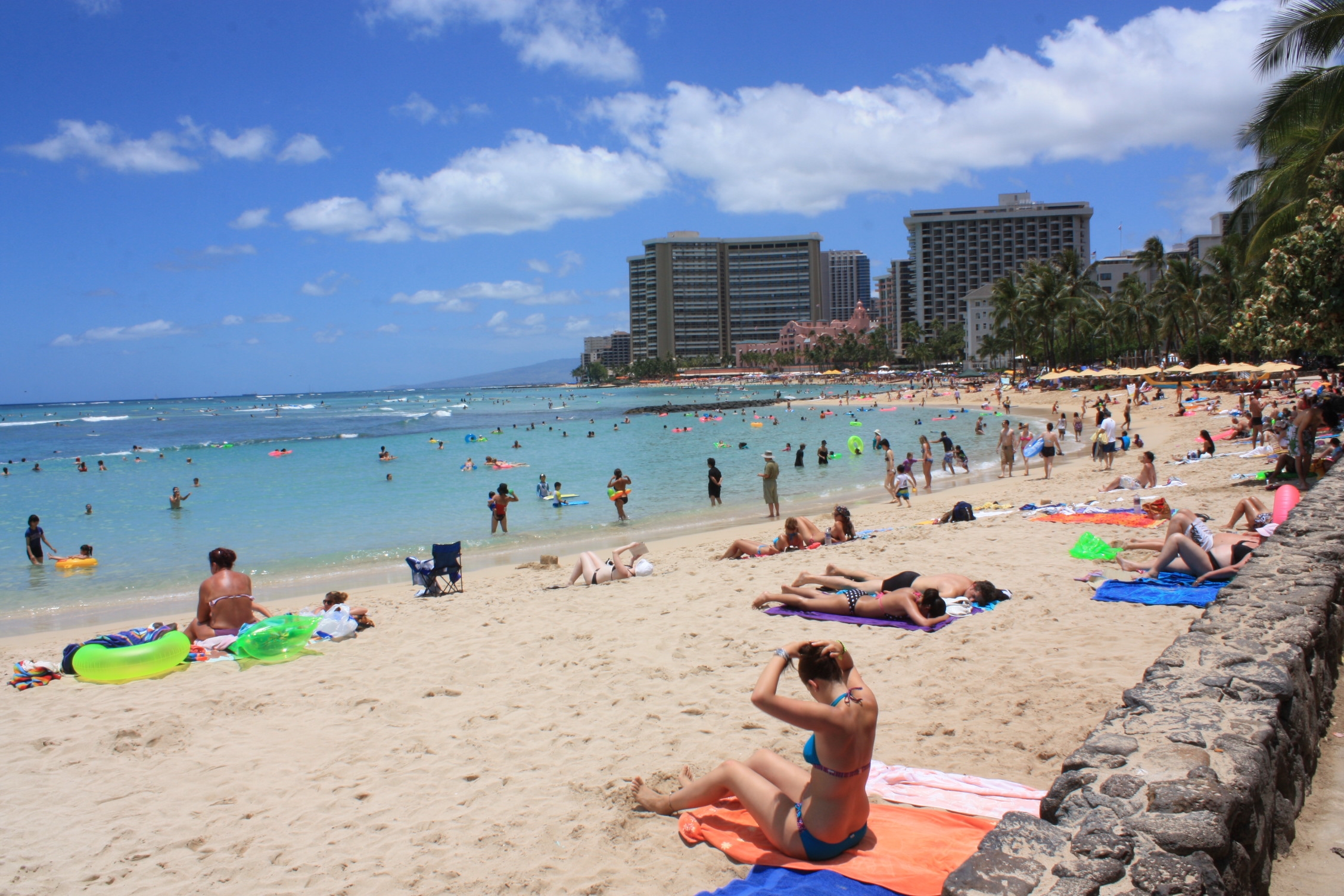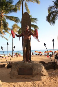 Nous rejoignons Waikiki en navette, le quartier touristique de Honolulu, la plus grosse ville de l’île d’Oahu. Cette ville est réputée pour sa constante activité festive et son allure de station balnéaire, qui attirent les touristes du monde entier, dont énormément de canadiens et de japonais. Hawaii est d’ailleurs très prisé des jeunes mariés, qui viennent ici fêter leur nouvelle union.