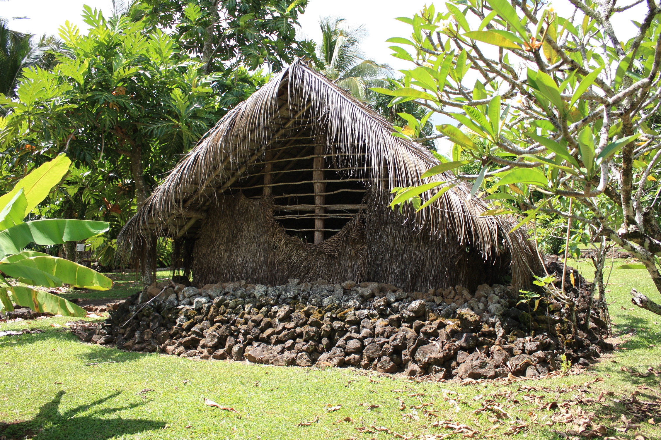 Une toute petite dame nous sert de guide pour la visite des différents bâtiments du village. Elle nous raconte tous les rites et coutumes des premiers habitants de Hawaii et nous initie à la médecine traditionnelle, nous faisant toucher, sentir, goûter ces plantes/arbres que nous ne connaissons pas, ainsi qu’à des jeux de bowling et de lancer de bâton. Elle en profite également pour nous faire une démonstration de hula, et pour nous chanter des chansons de sa composition, accompagnée de son ukulélé. Nous sommes agréablement surpris de cette visite et passons une belle matinée en sa compagnie.